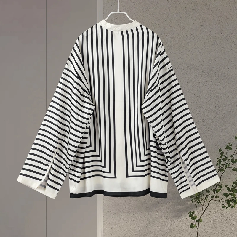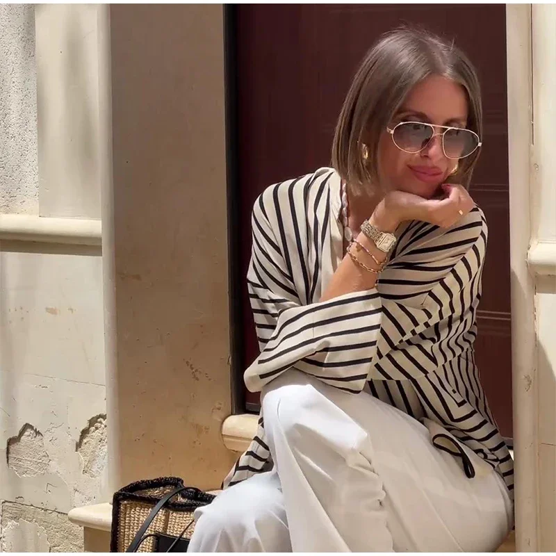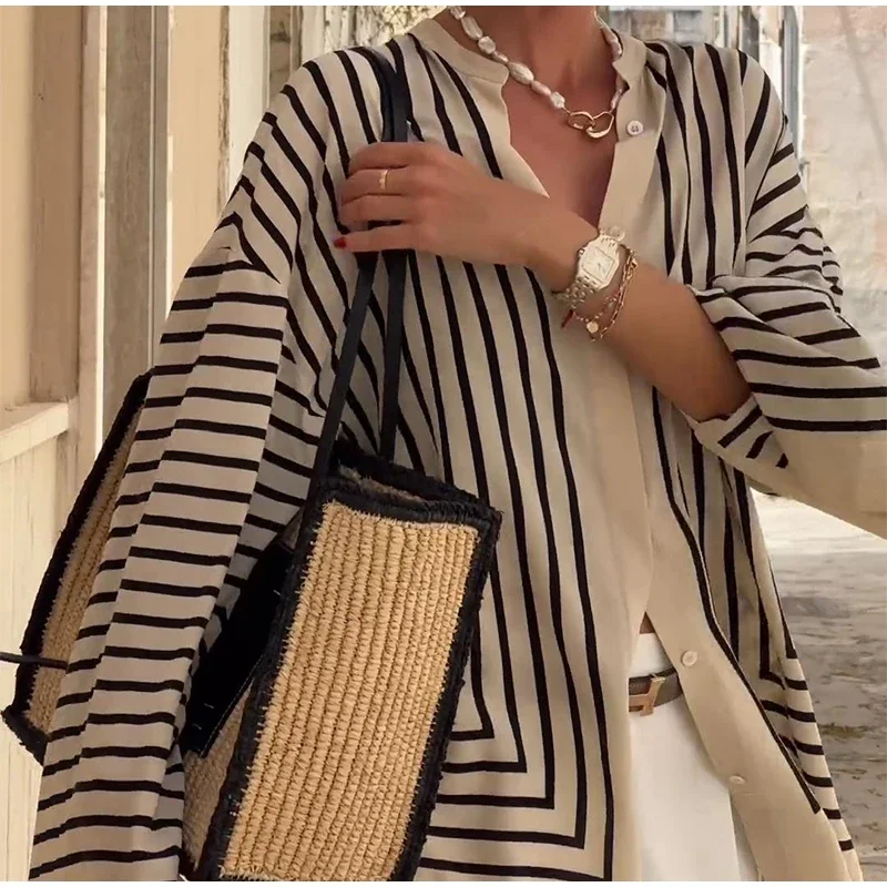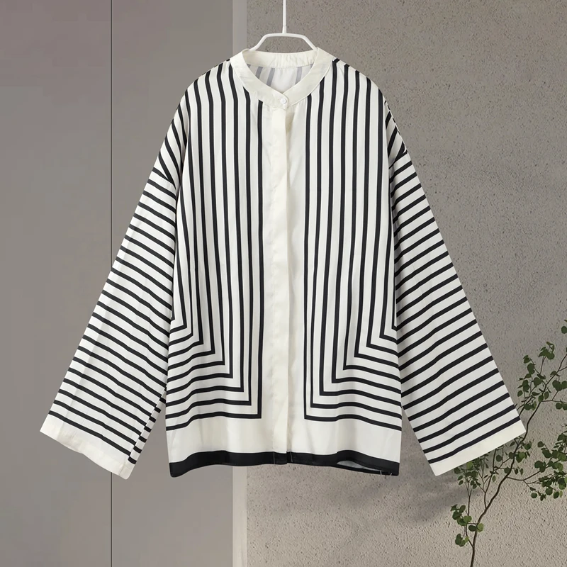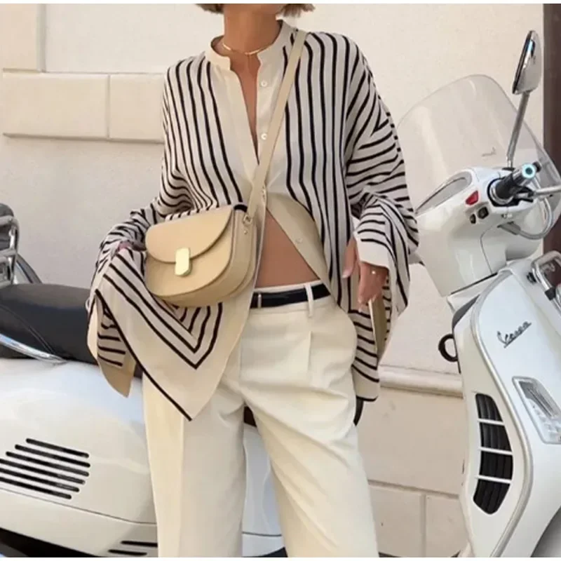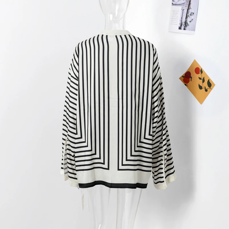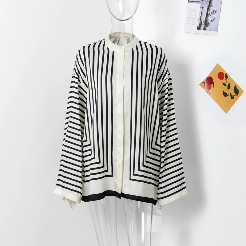 قمصان حريرية مخططة غير رسمية للنساء ، فضفاضة برقبة دائرية ، صدر واحد ، قميص بأكمام طويلة مضيئة ، بلوزة نسائية ، قمم جديدة للسيدات ، الخريف ،