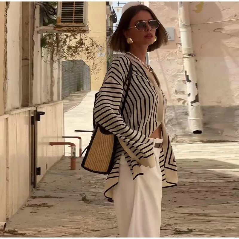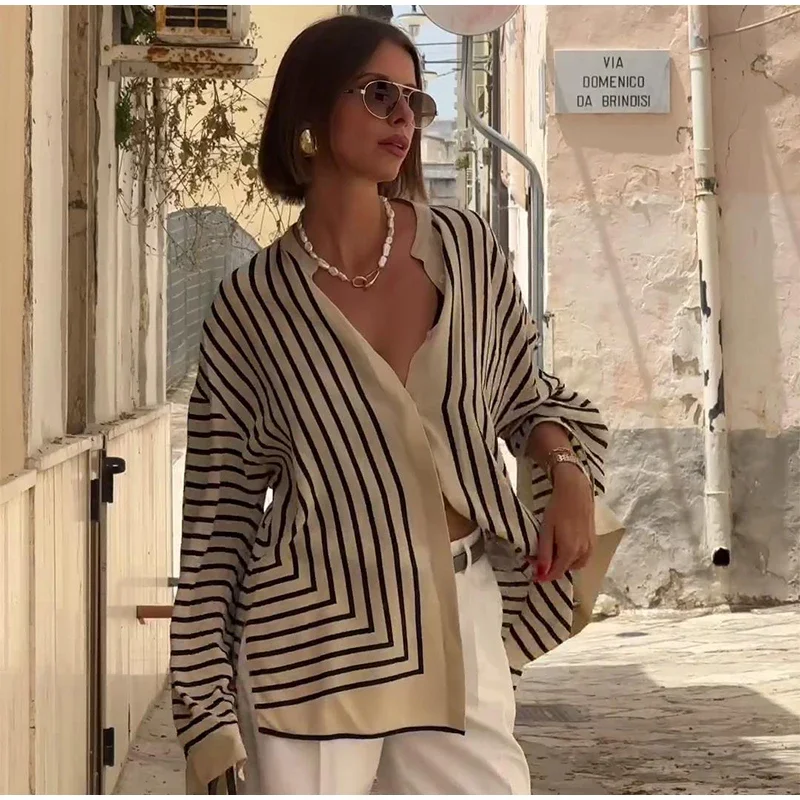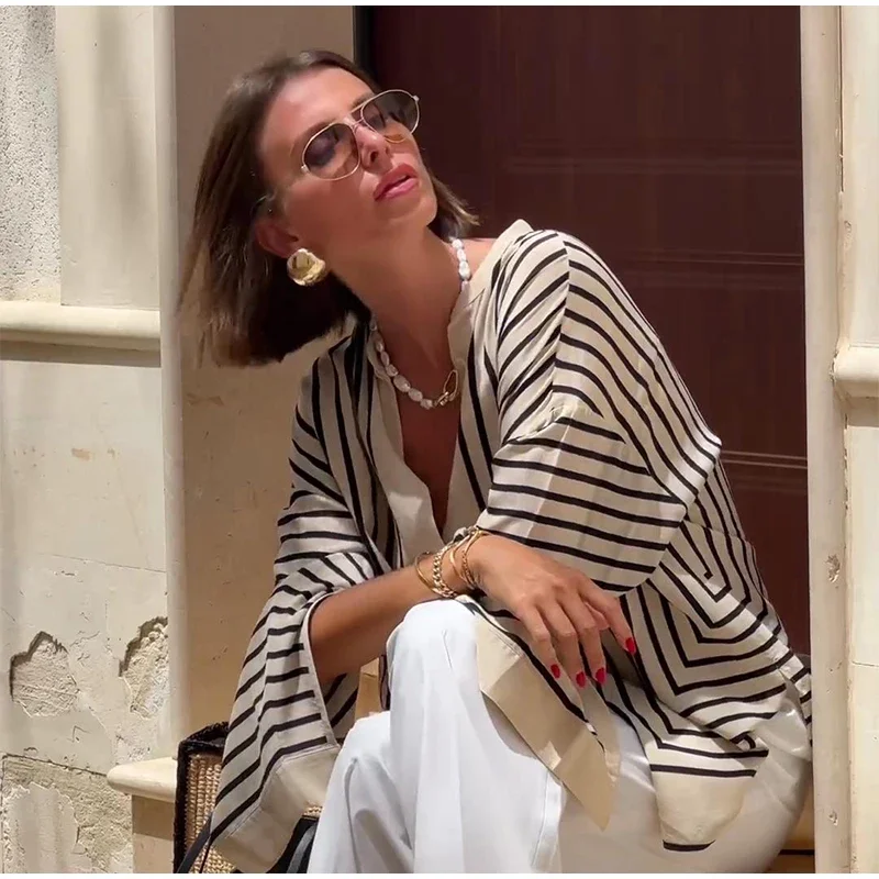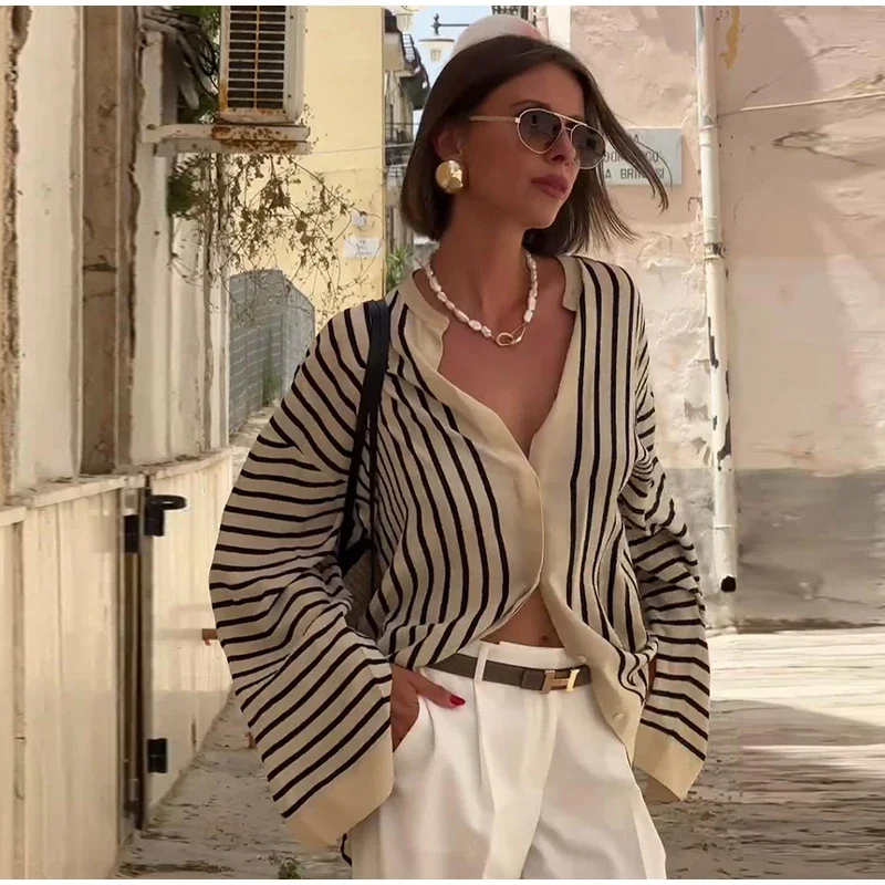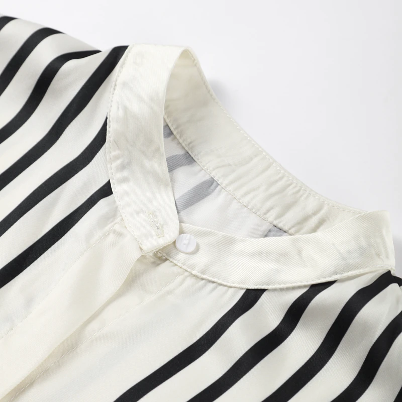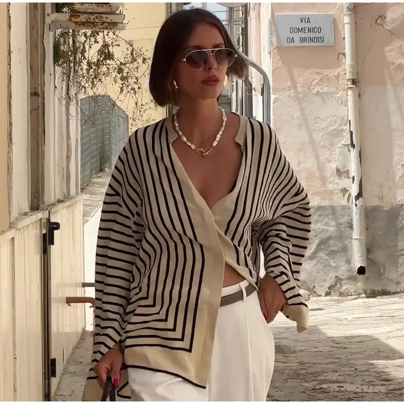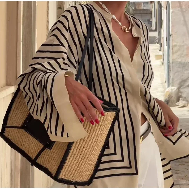 قمصان حريرية مخططة غير رسمية للنساء ، فضفاضة برقبة دائرية ، صدر واحد ، قميص بأكمام طويلة مضيئة ، بلوزة نسائية ، قمم جديدة للسيدات ، الخريف ،
