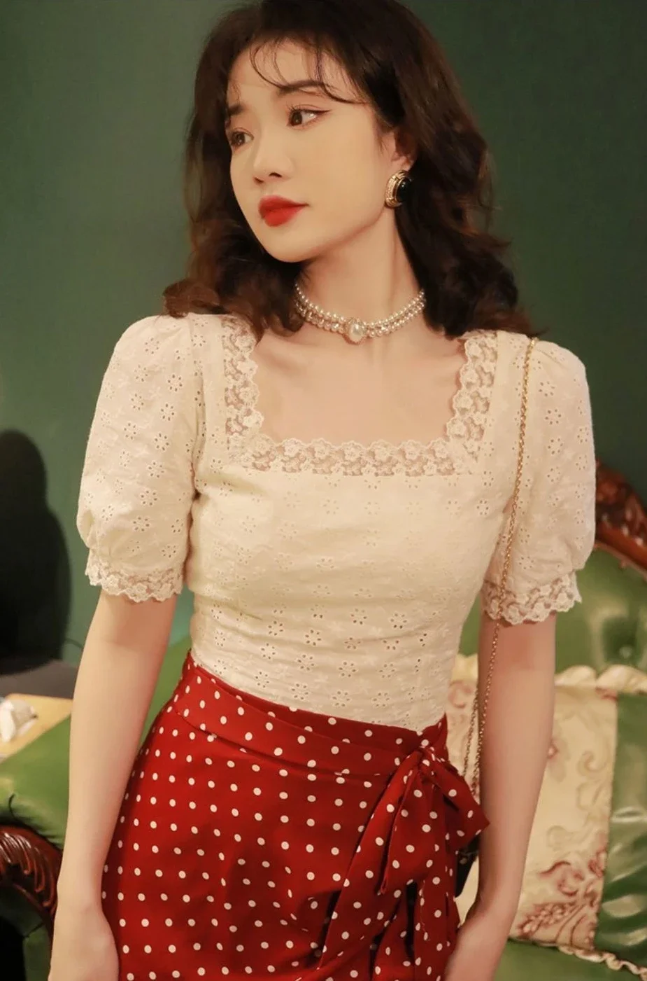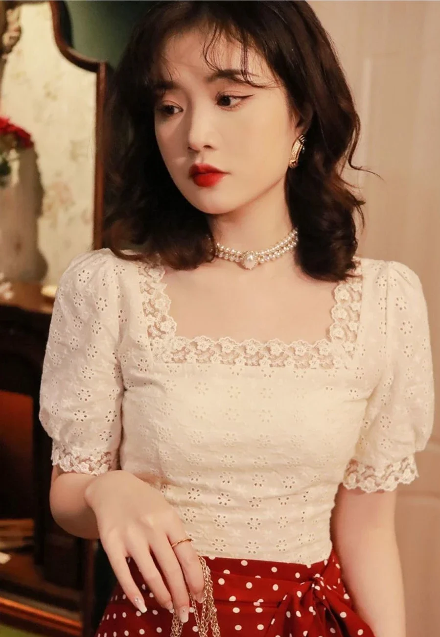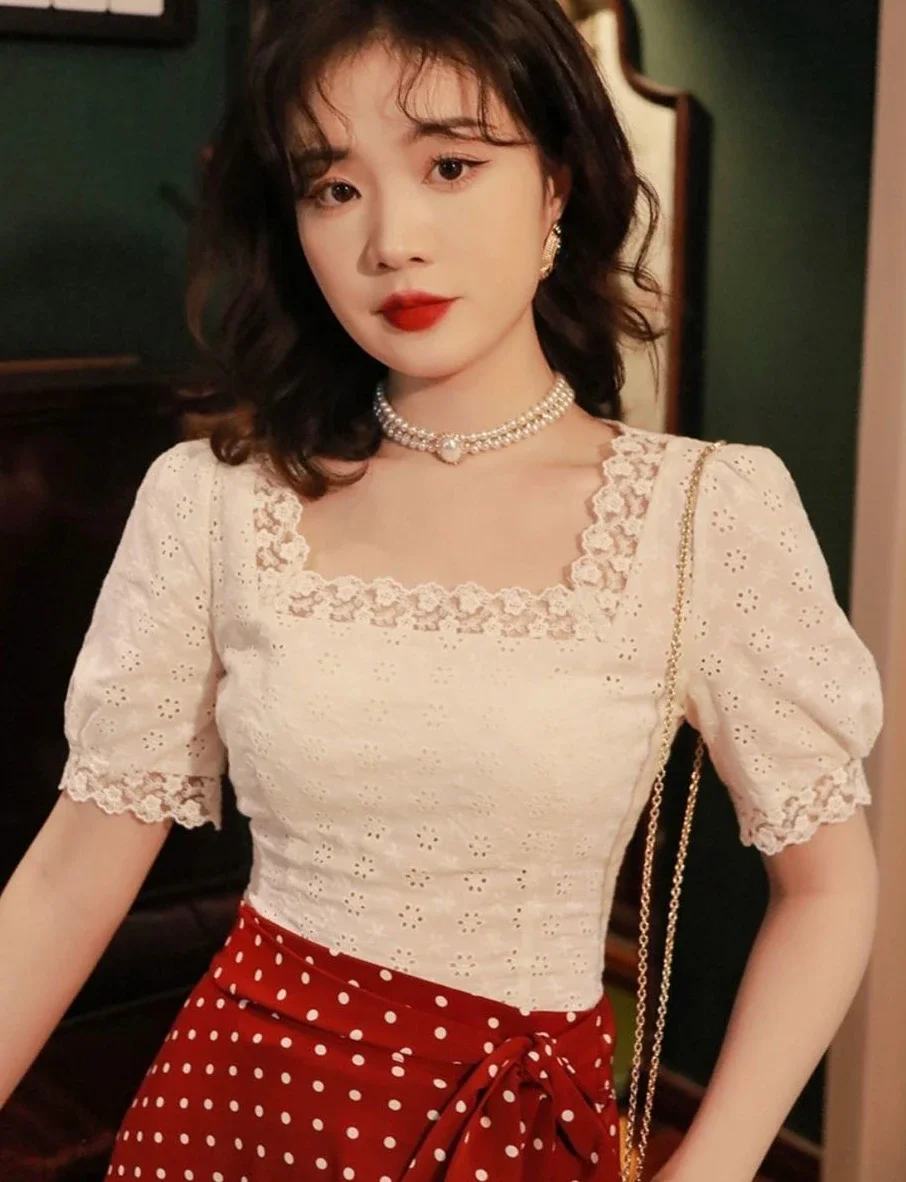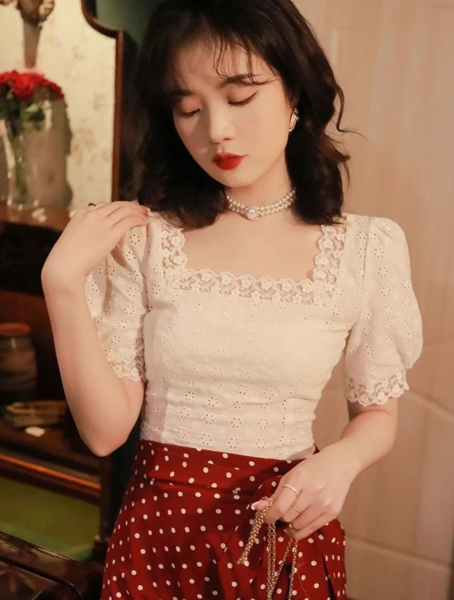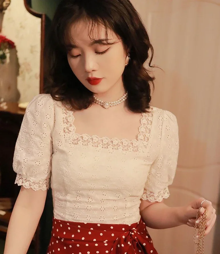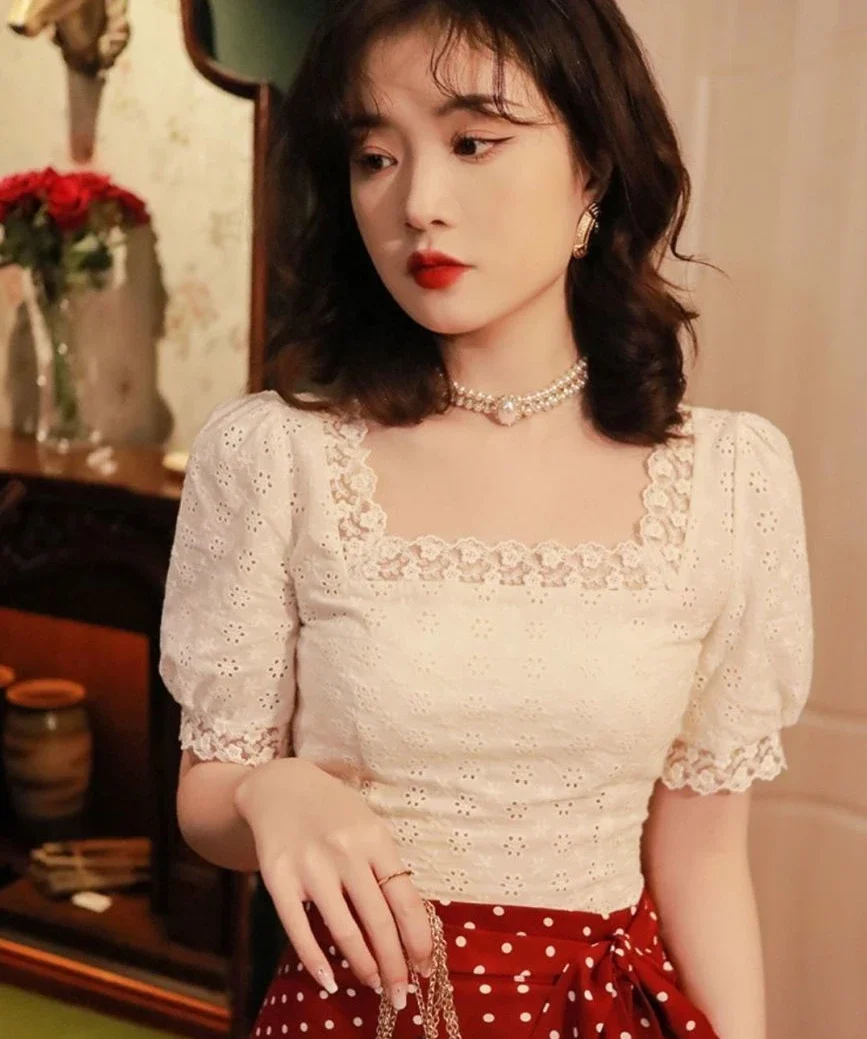 قمصان وبلوزات بأكمام قصيرة للنساء ، بلوزة جمالية عتيقة ، تطريز مثير ، أبيض ، ملابس شبابية ، جديد ، صيف ، من من من من من من من من من من القطن