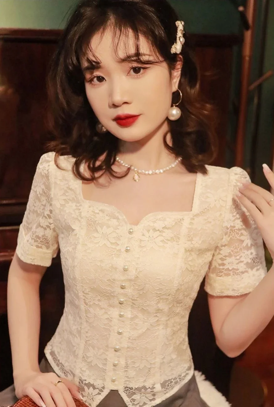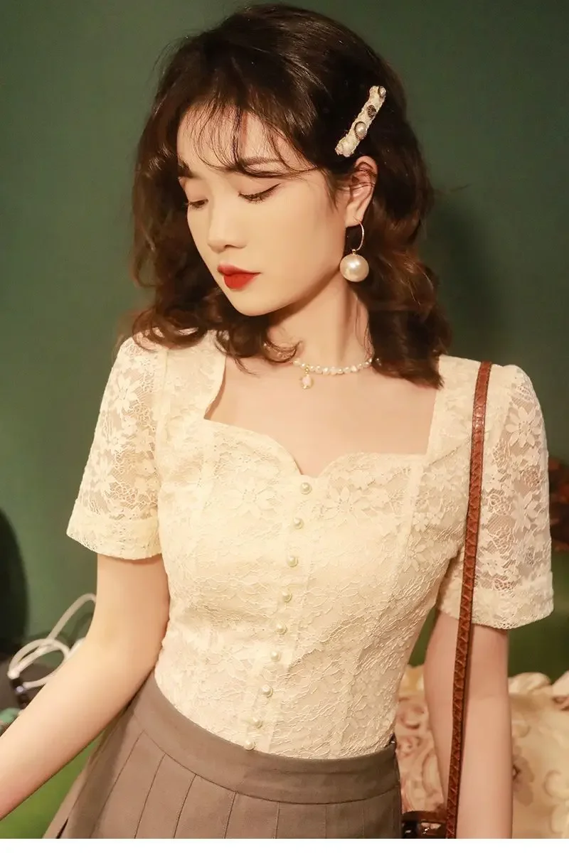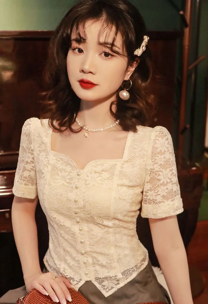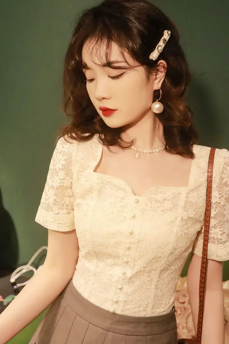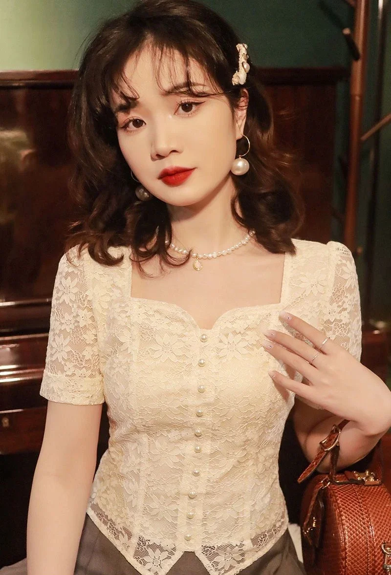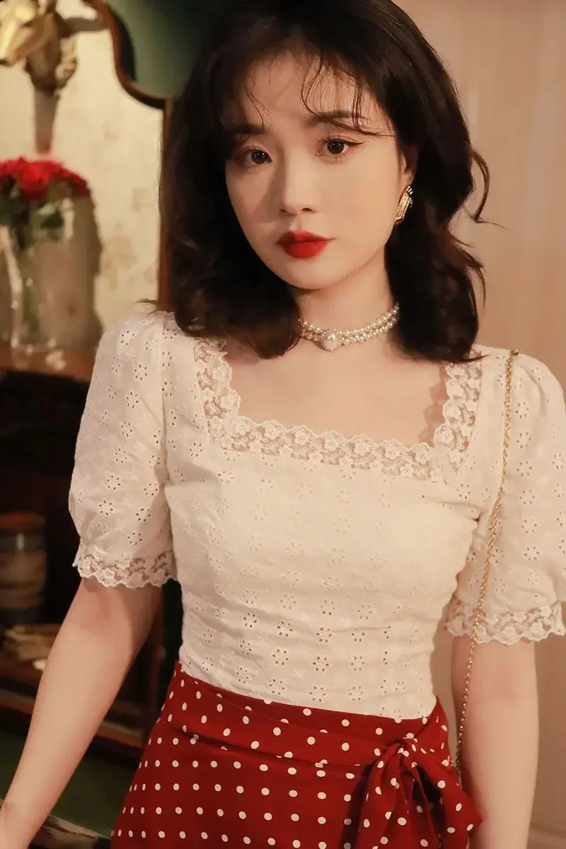 قمصان وبلوزات بأكمام قصيرة للنساء ، بلوزة جمالية عتيقة ، تطريز مثير ، أبيض ، ملابس شبابية ، جديد ، صيف ، من من من من من من من من من من القطن