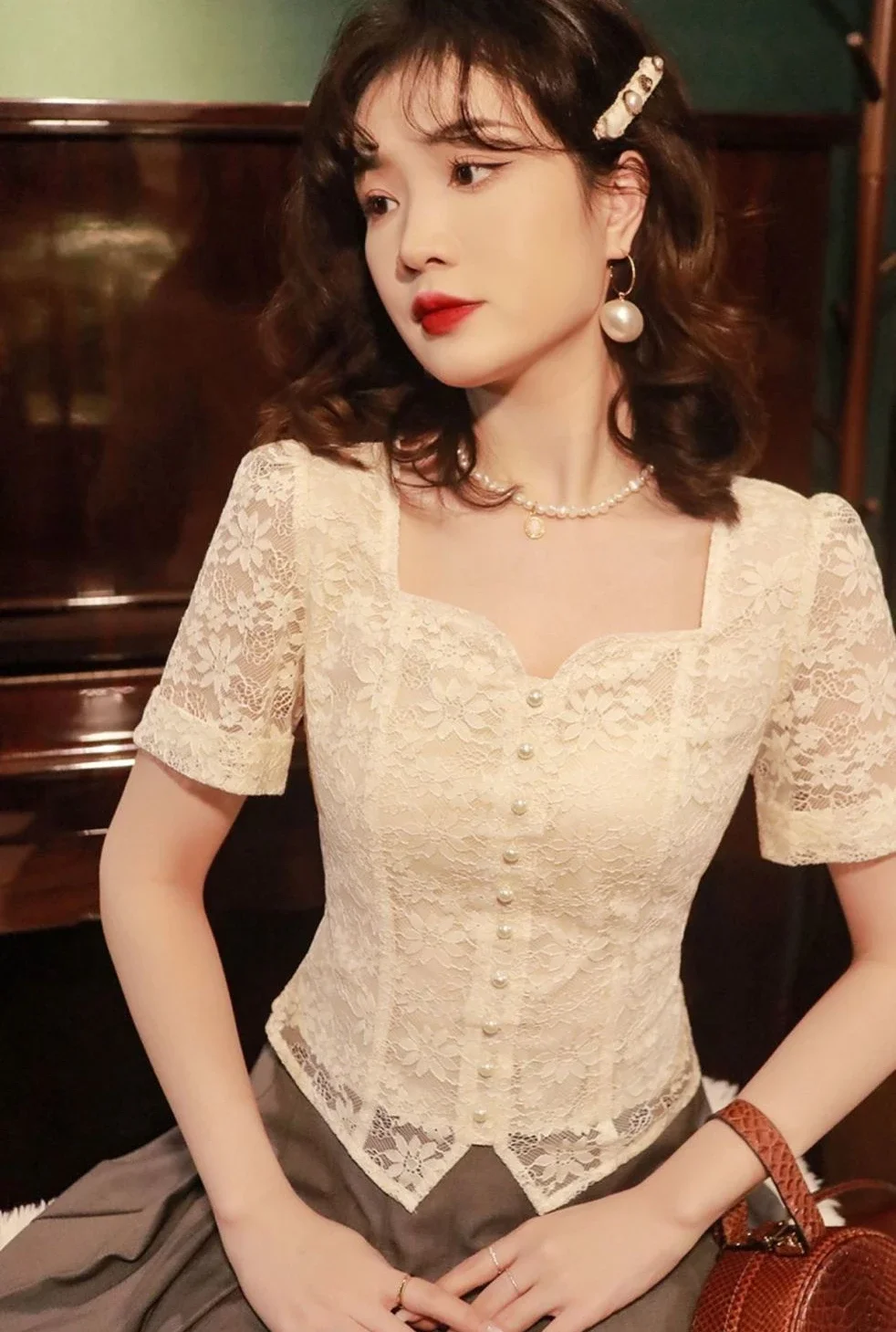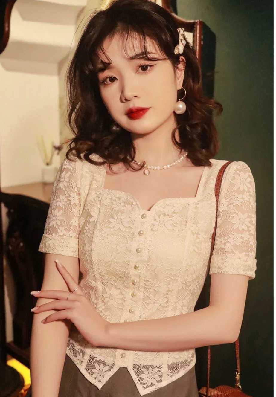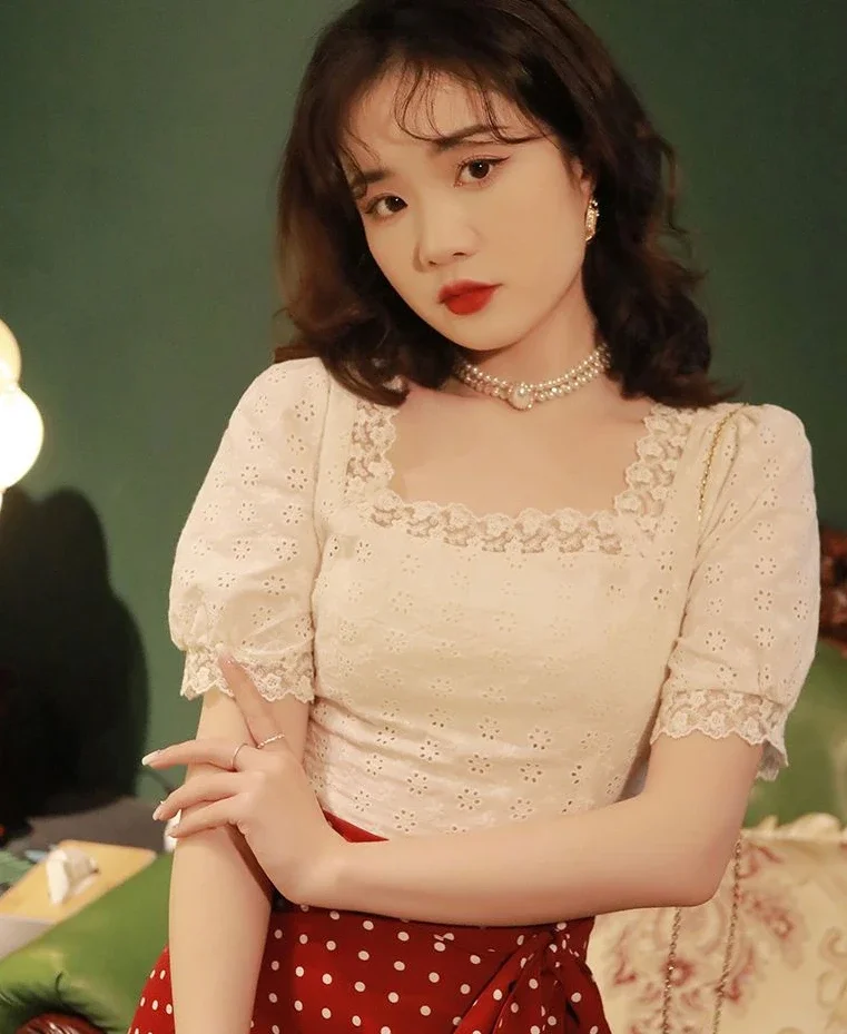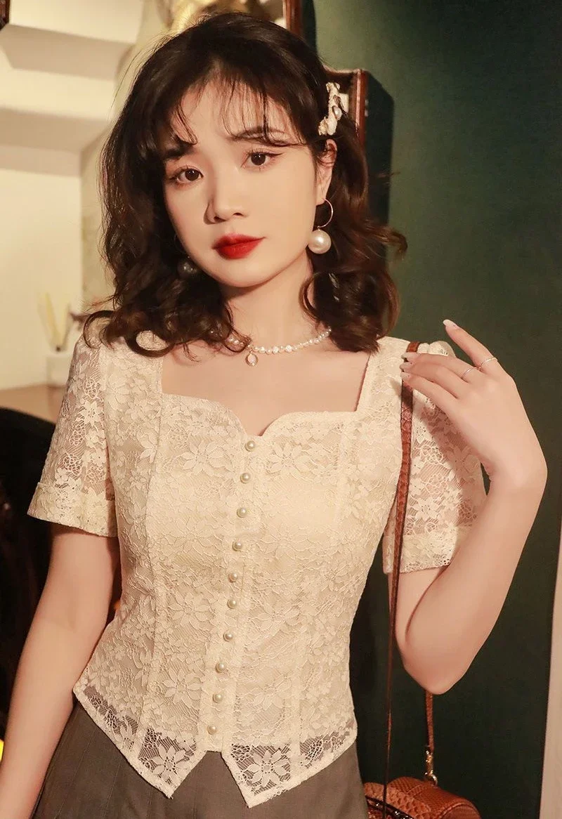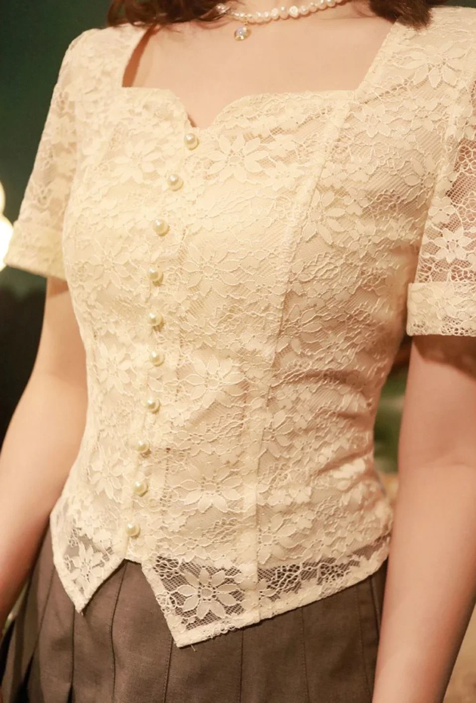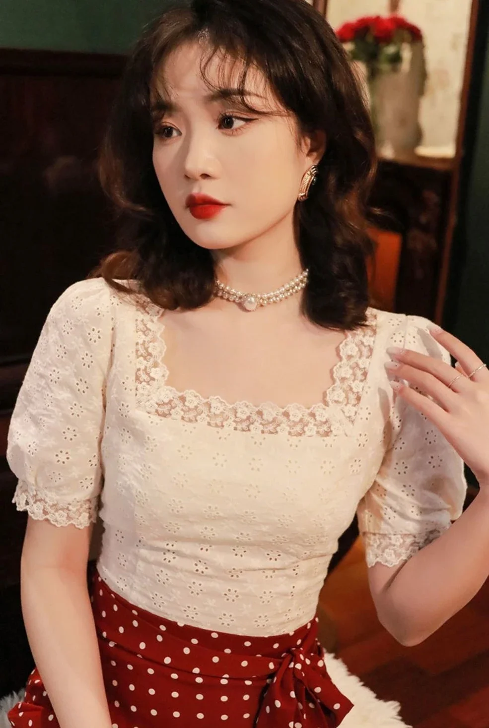 قمصان وبلوزات بأكمام قصيرة للنساء ، بلوزة جمالية عتيقة ، تطريز مثير ، أبيض ، ملابس شبابية ، جديد ، صيف ، من من من من من من من من من من القطن