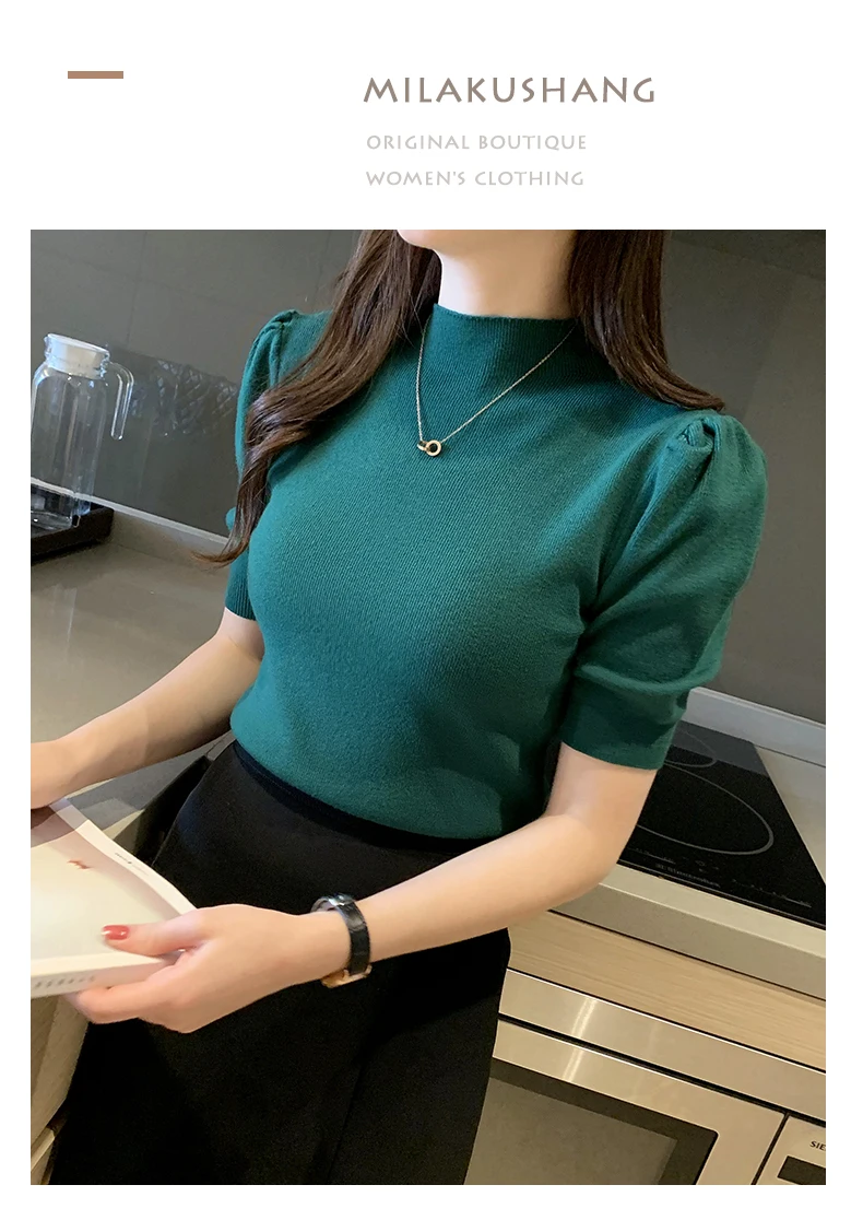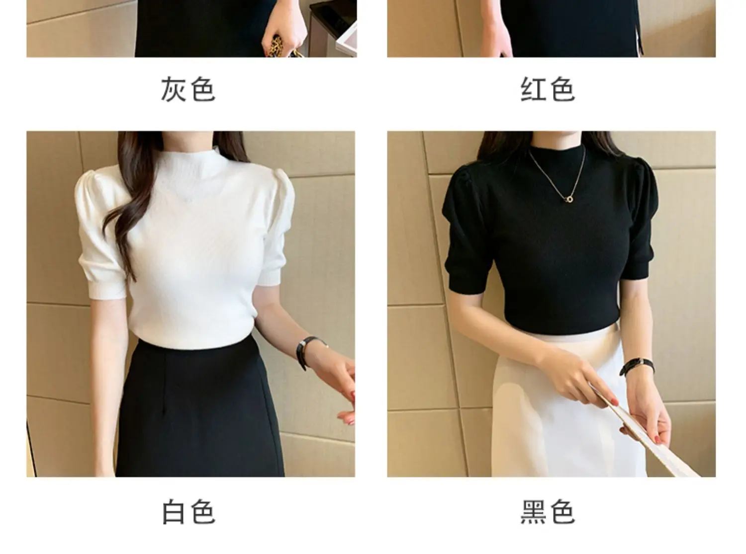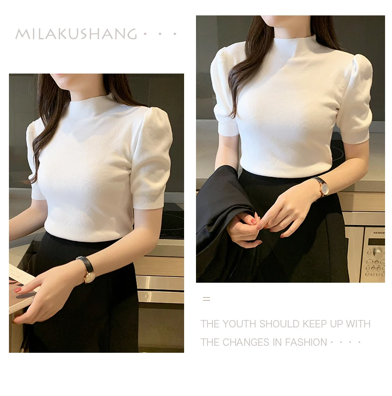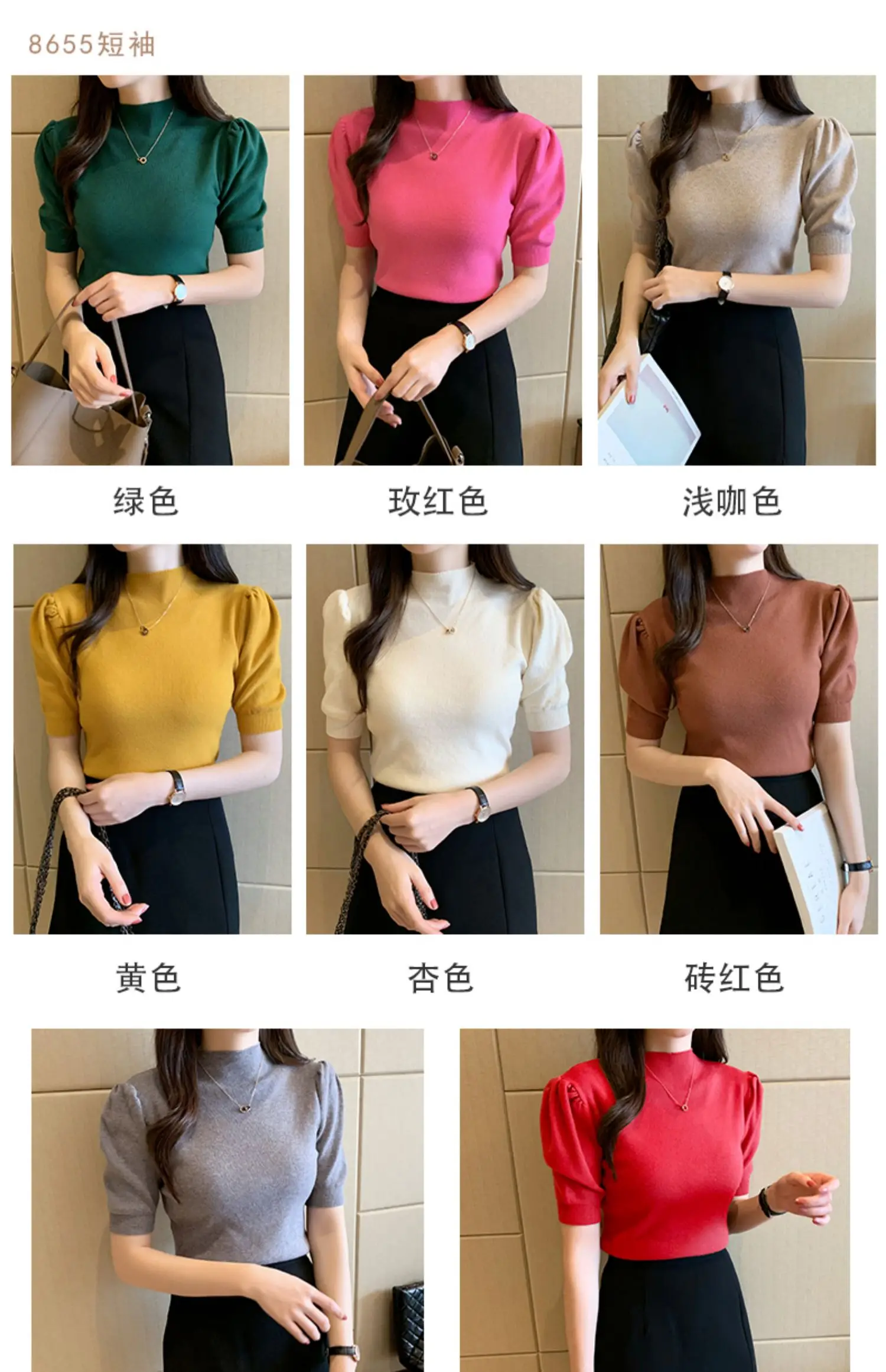 قميص نسائي ربيعي كوري بأكمام منتفخة غير رسمية لصيف 2025 بلوزة محبوكة بنصف الياقة المدورة قطع علوية ضيقة للسيدات 18848
