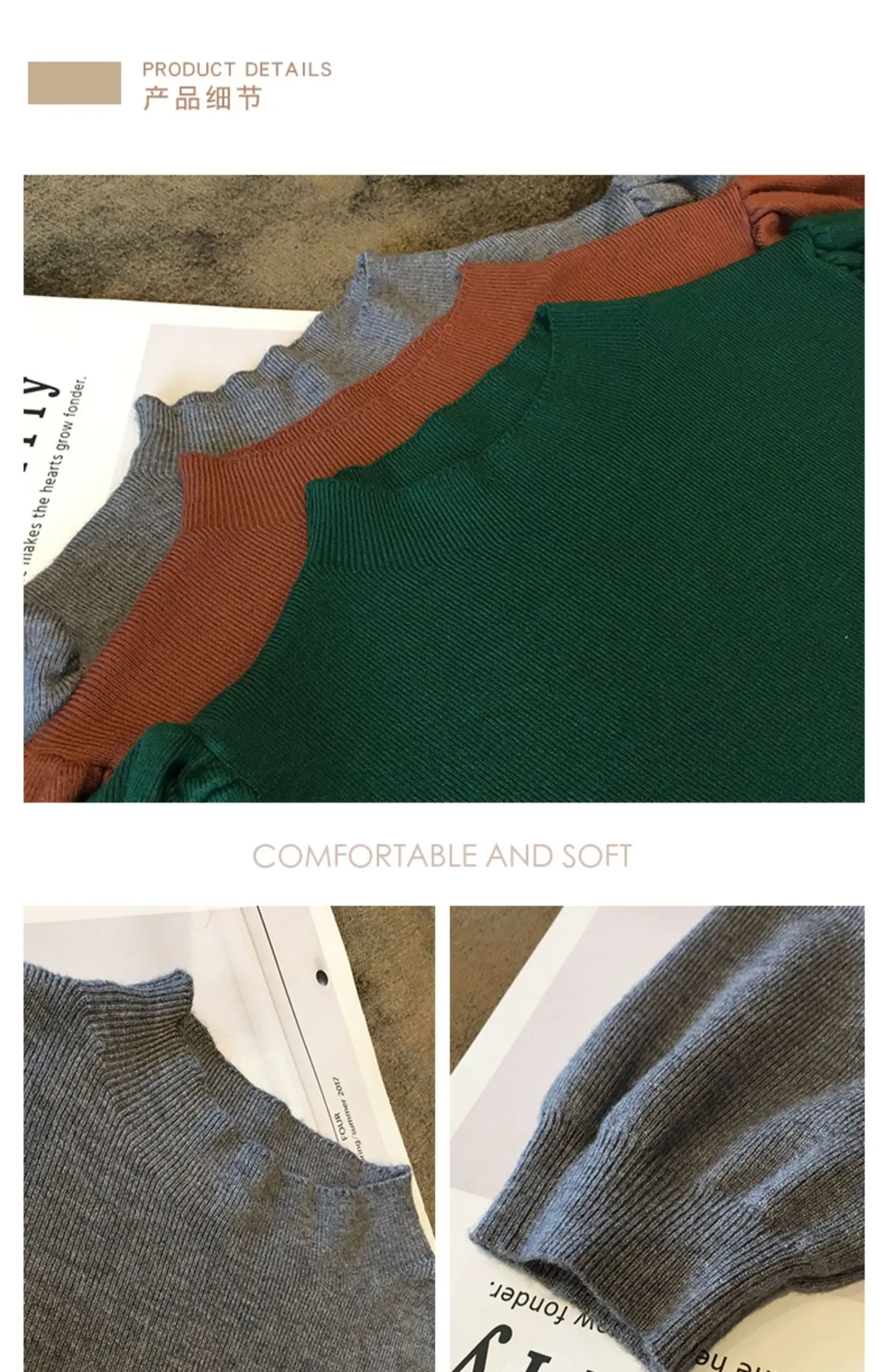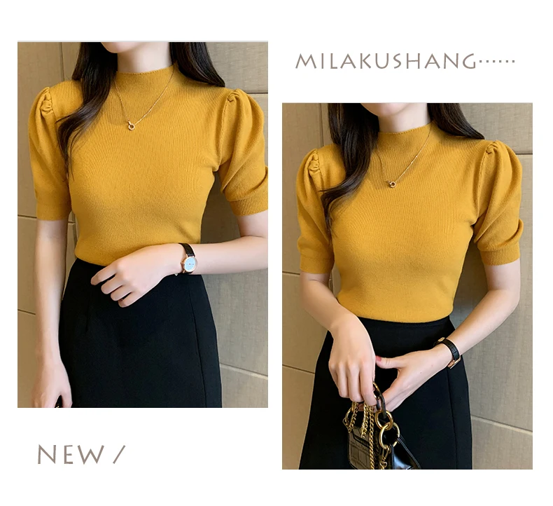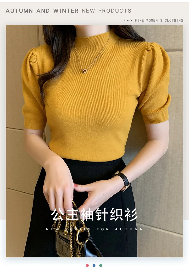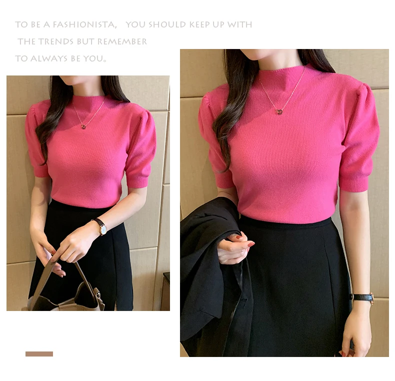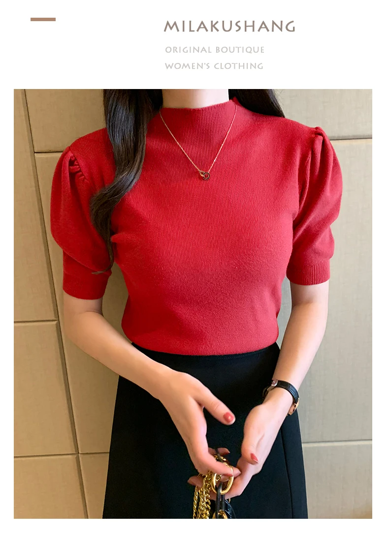 قميص نسائي ربيعي كوري بأكمام منتفخة غير رسمية لصيف 2025 بلوزة محبوكة بنصف الياقة المدورة قطع علوية ضيقة للسيدات 18848