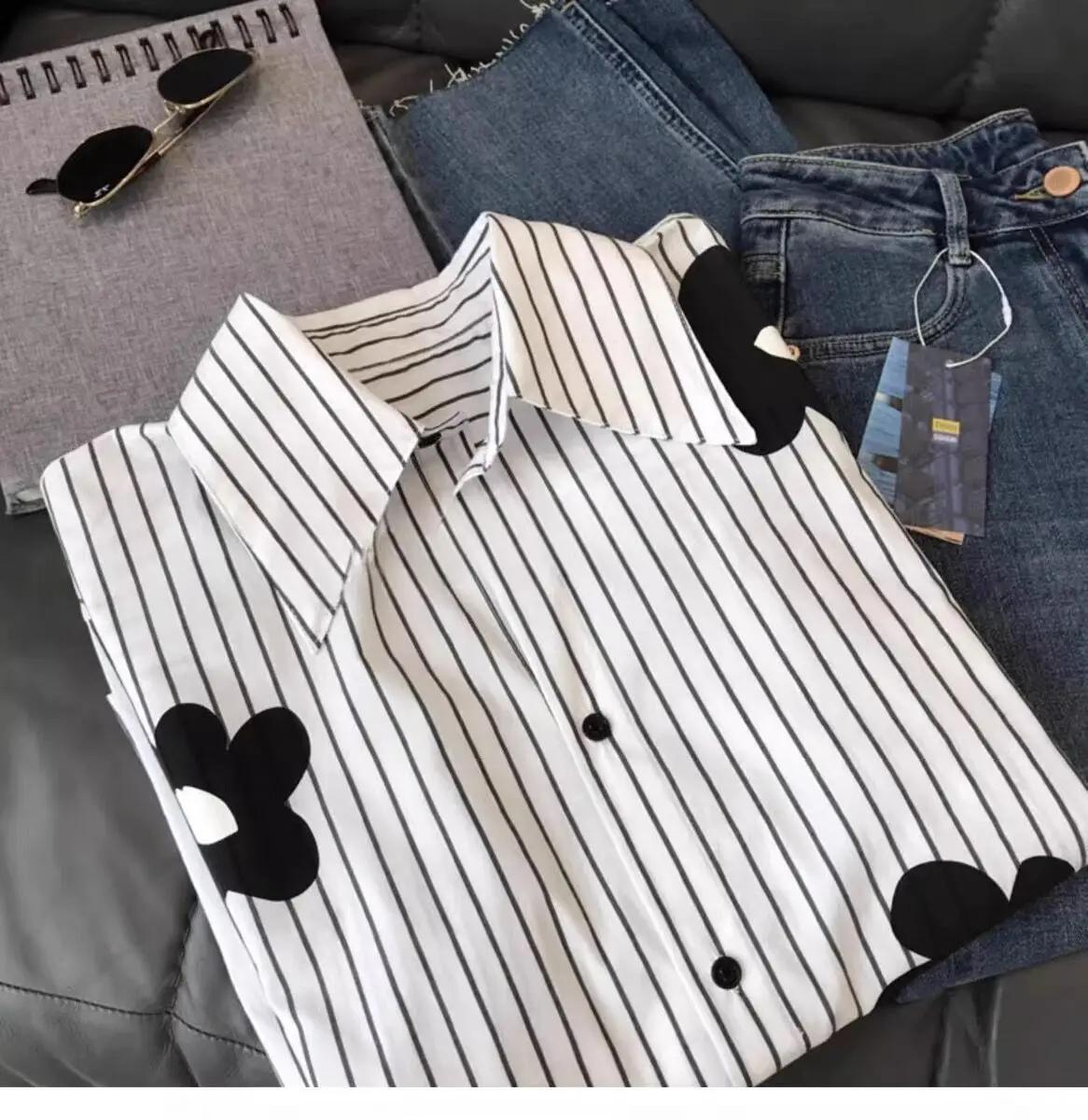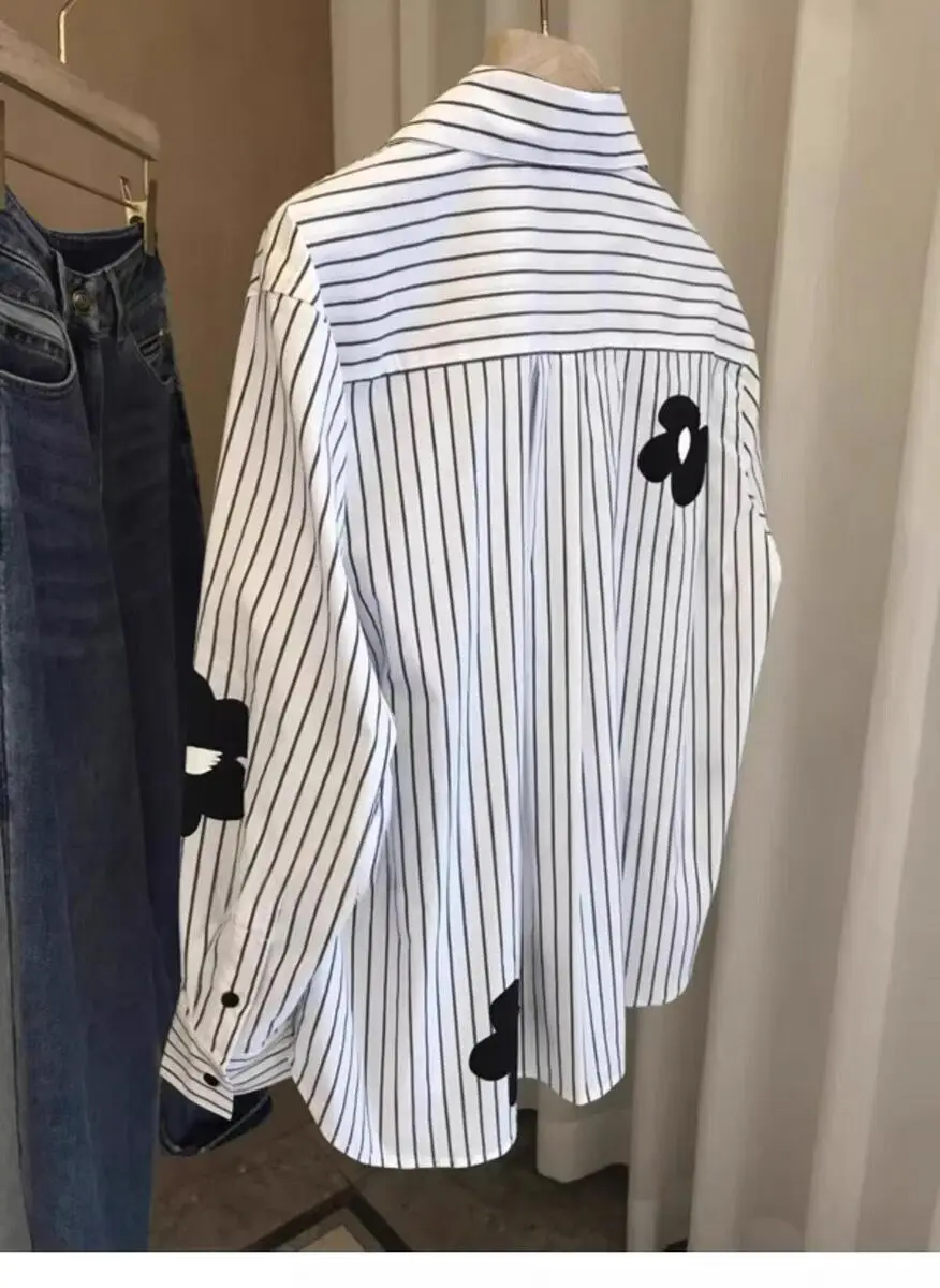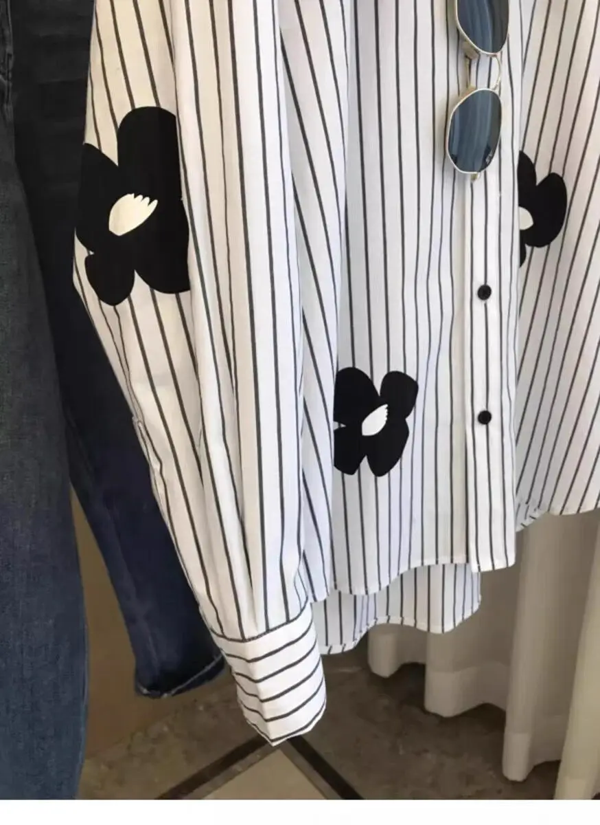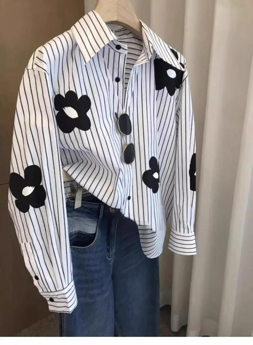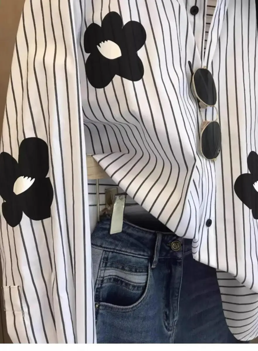 ملابس نسائية عصرية بأكمام طويلة قطع علوية للسيدات مُزينة بالزهور 2024 قمصان جديدة بأزرار حلوة بلوزات مطبوعة مخططة