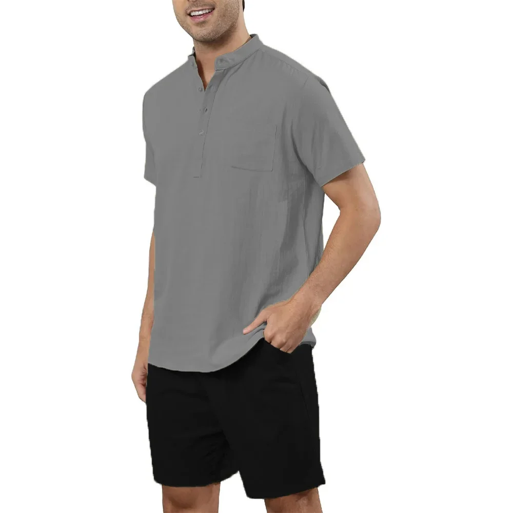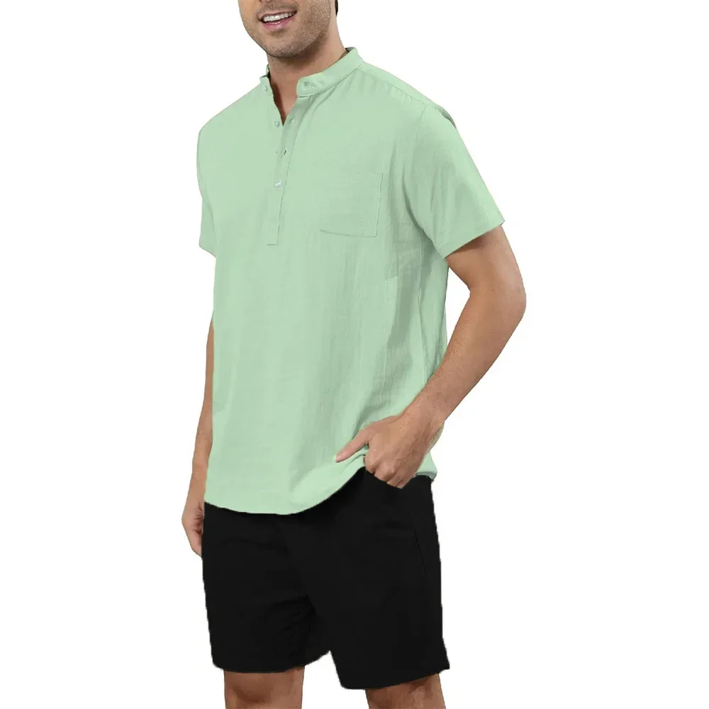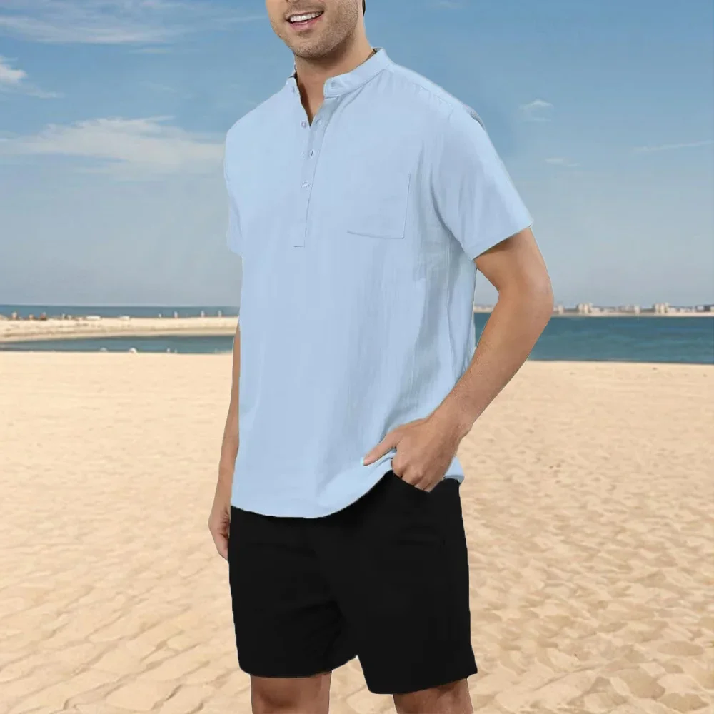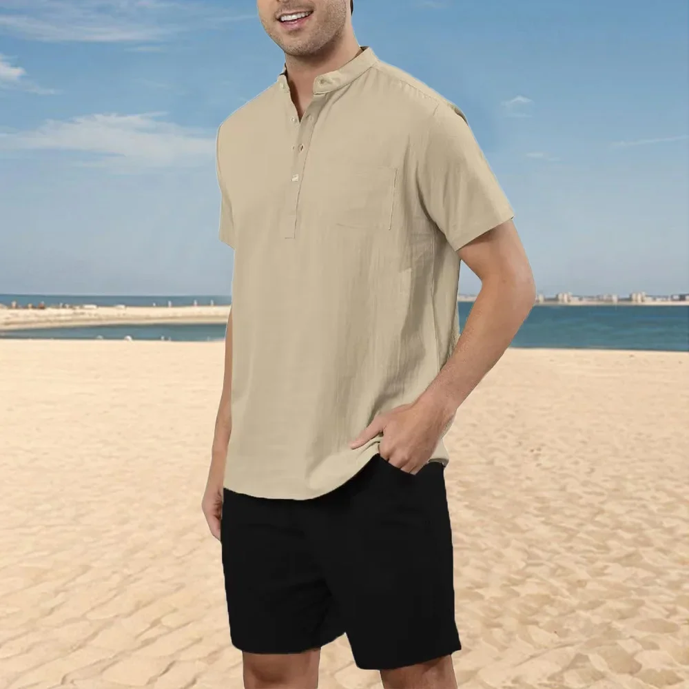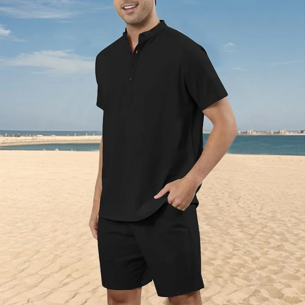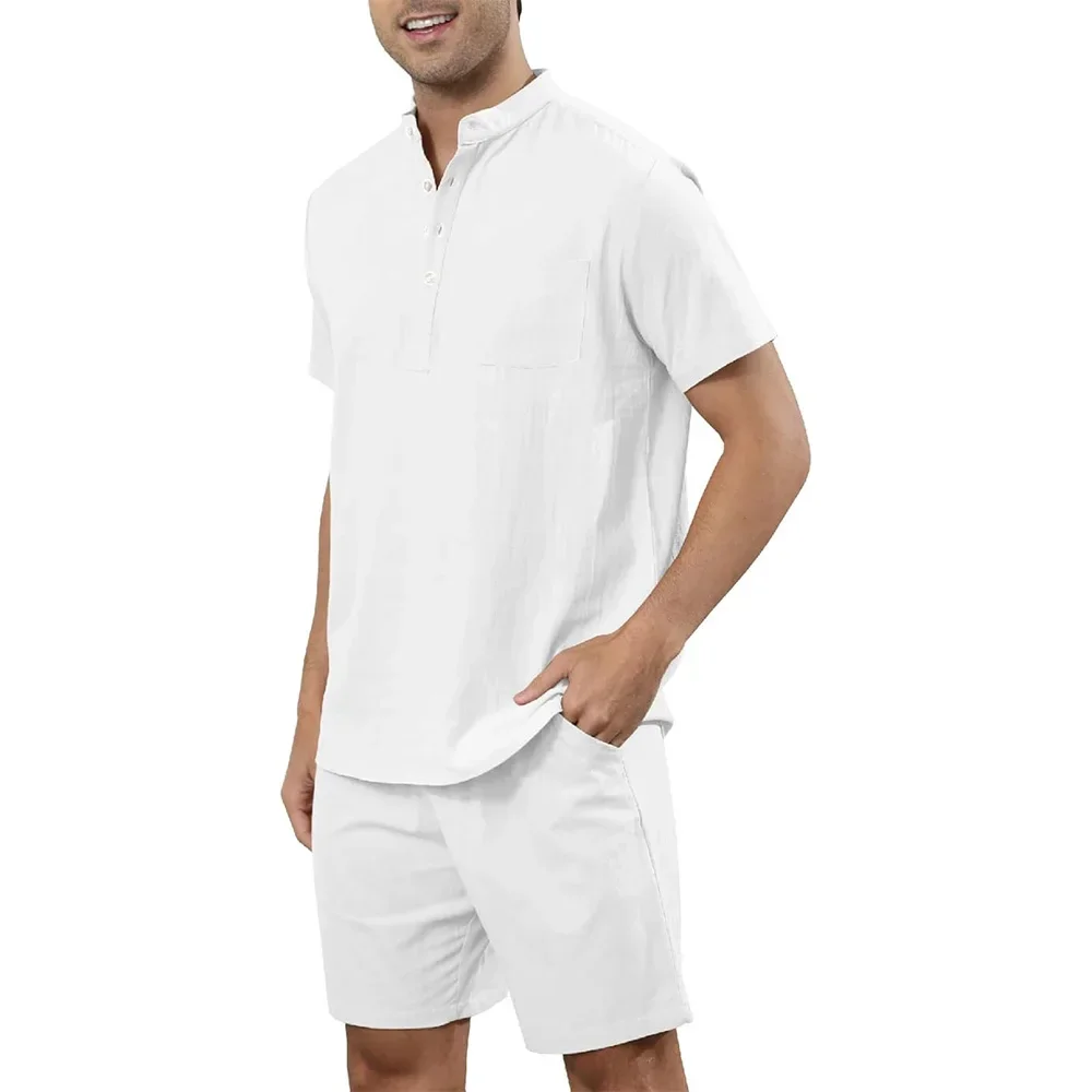 2 قطعة مجموعات الرجال القطن الكتان هينلي قمصان السراويل وتتسابق السفر عطلة الشاطئ ملابس الصيف عادية الصلبة اليومية