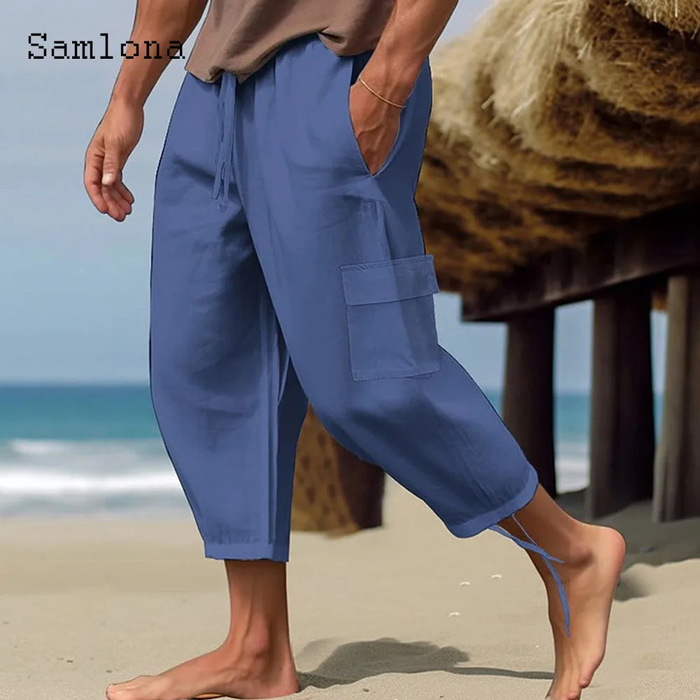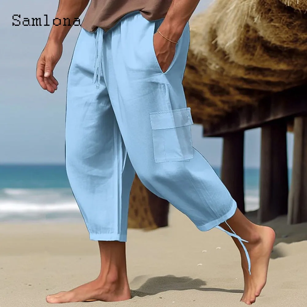 2023 الرجال الموضة الأنيقة مشبك الكفة الكتان السراويل الصلبة الأبيض الكاحل طول بنطلون حجم كبير رجالي عادية الرباط Sweatpants