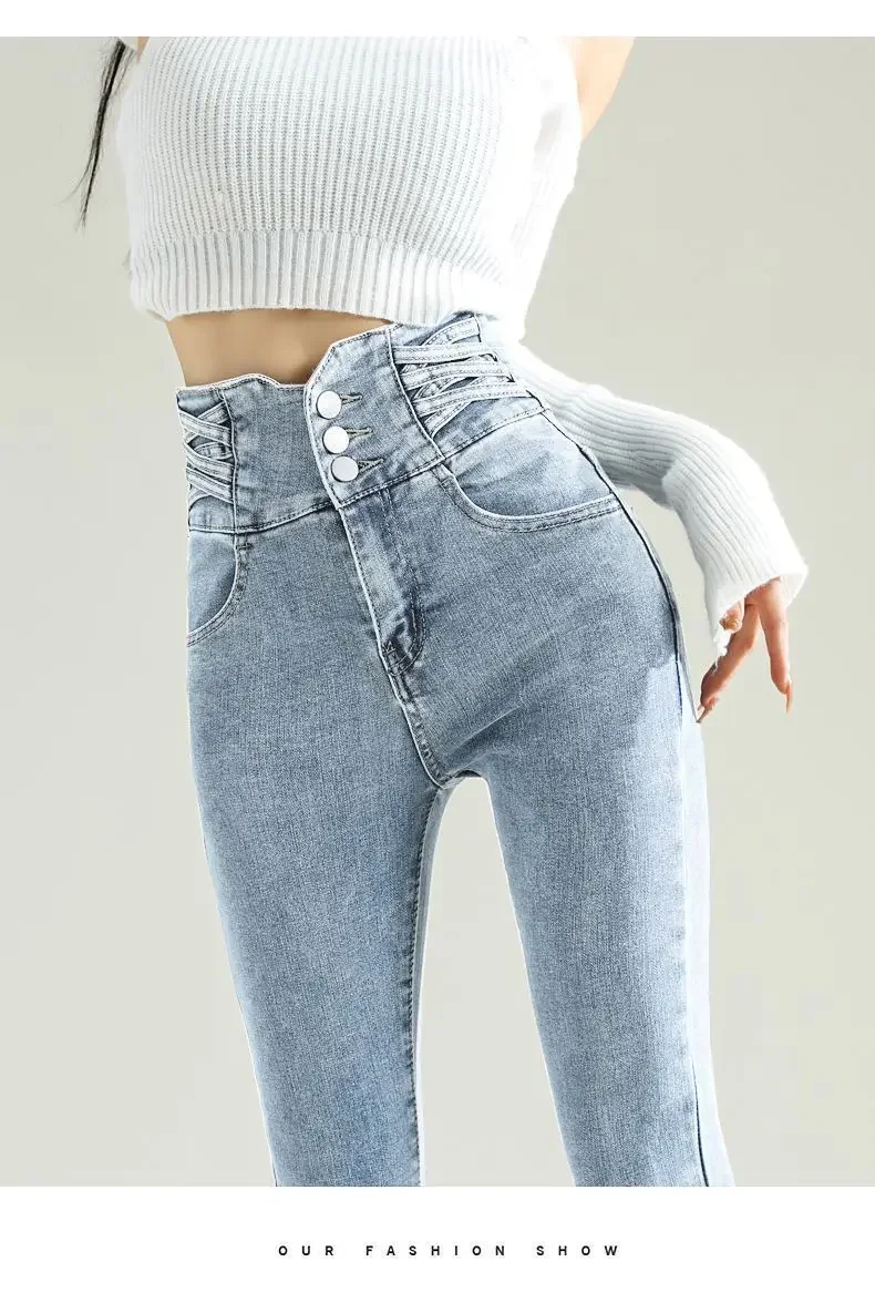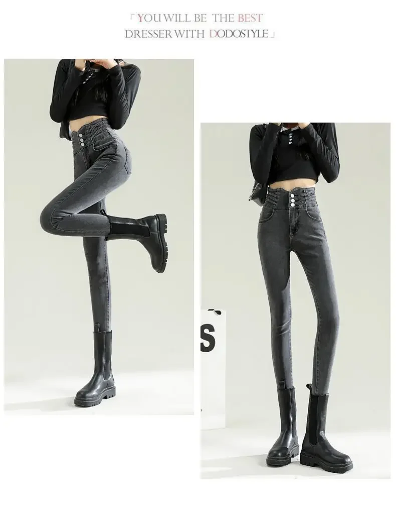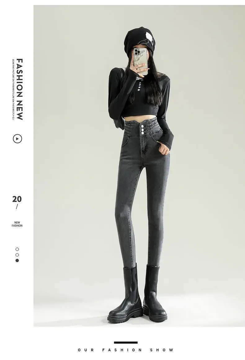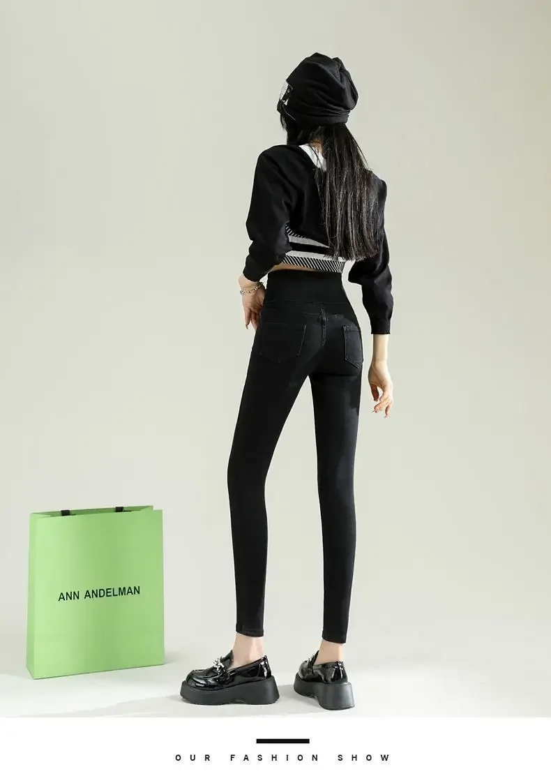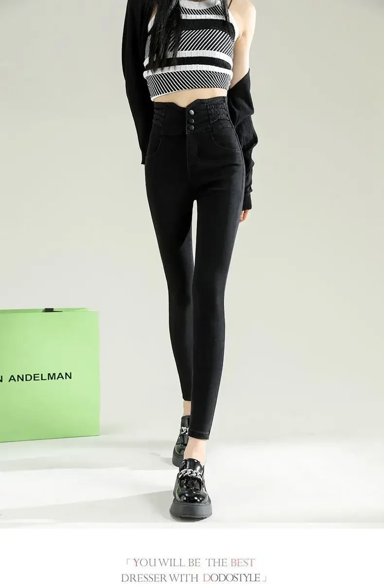 BlackJeansWomen'sDesign عالية الخصر التخسيس صف واحد زرر مطاطا منتصف طول الدينيم السراويل تعزز خط الأرداف الخاص بك