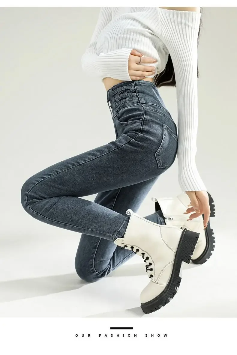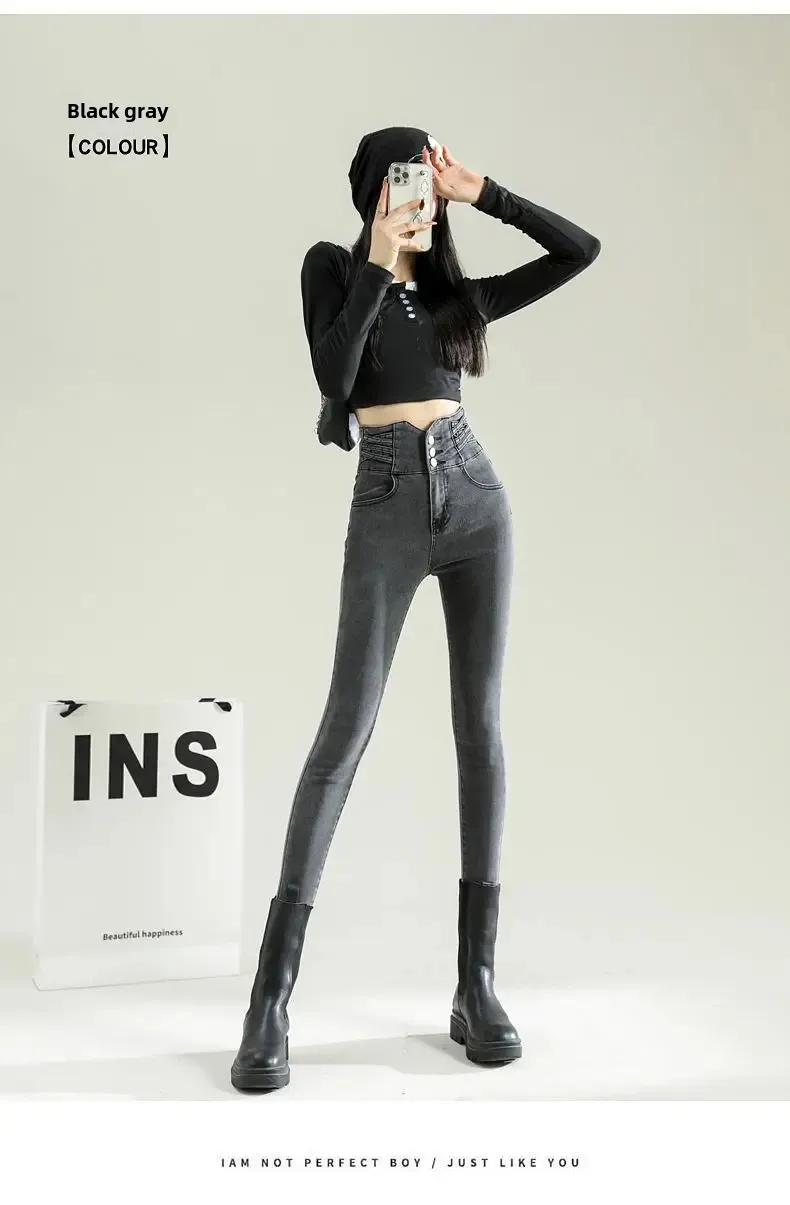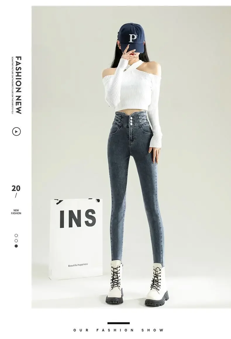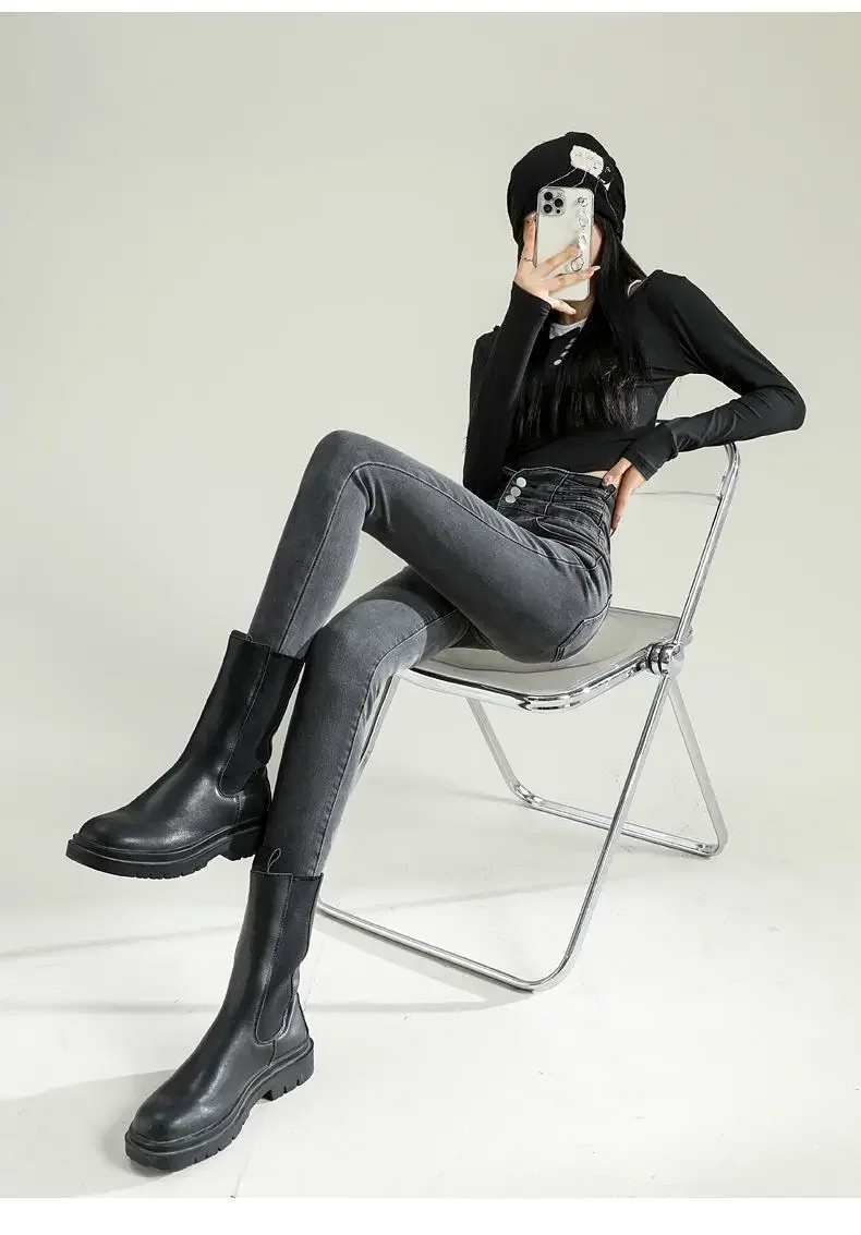 BlackJeansWomen'sDesign عالية الخصر التخسيس صف واحد زرر مطاطا منتصف طول الدينيم السراويل تعزز خط الأرداف الخاص بك