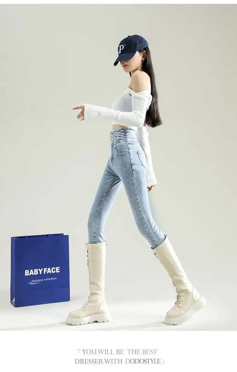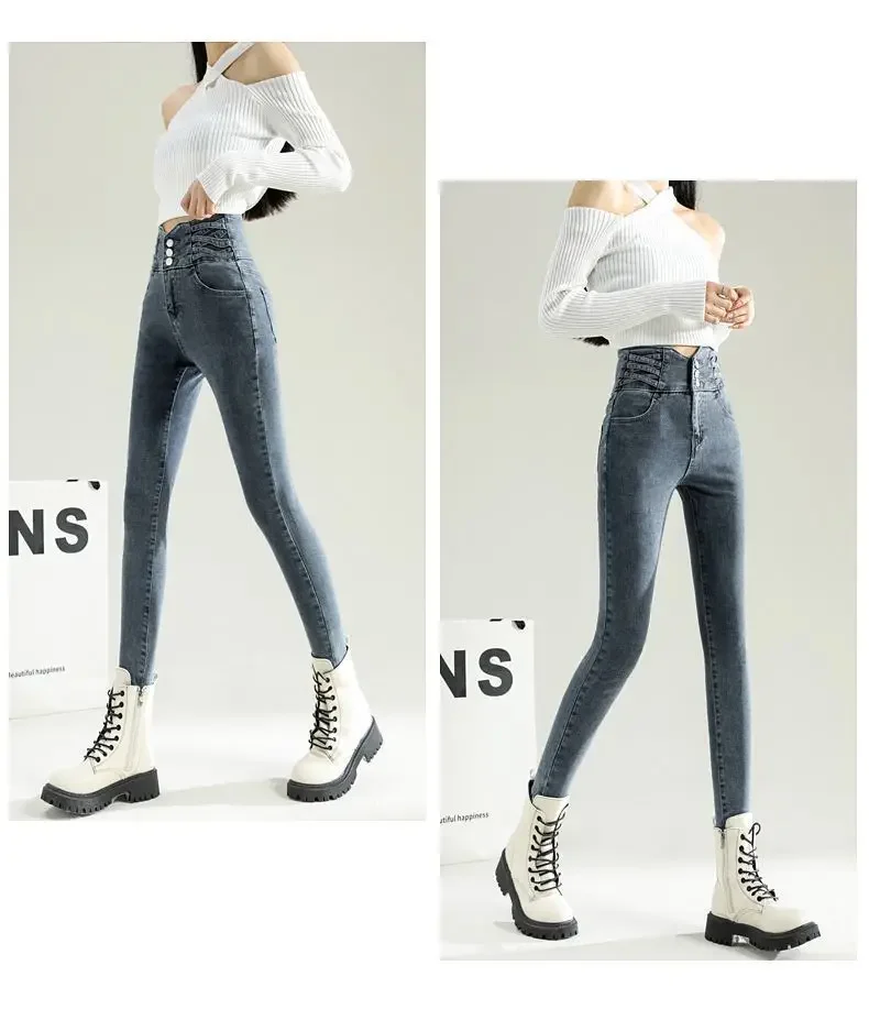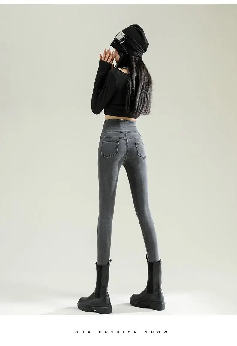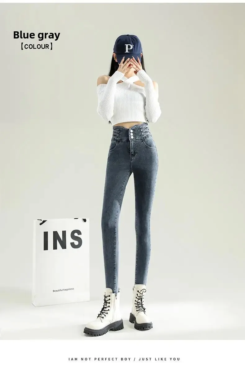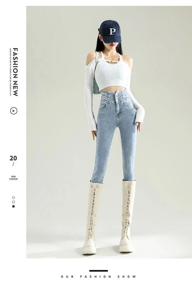 BlackJeansWomen'sDesign عالية الخصر التخسيس صف واحد زرر مطاطا منتصف طول الدينيم السراويل تعزز خط الأرداف الخاص بك