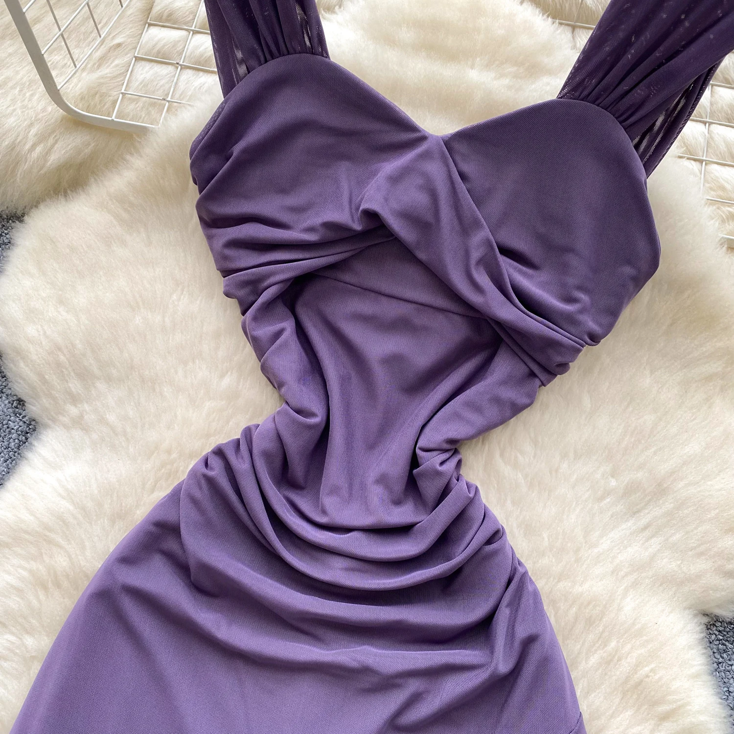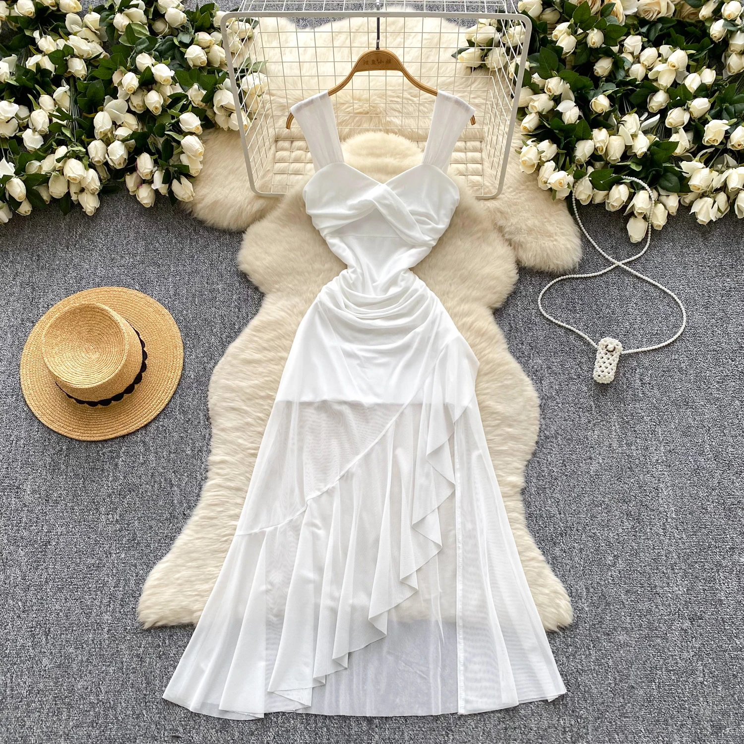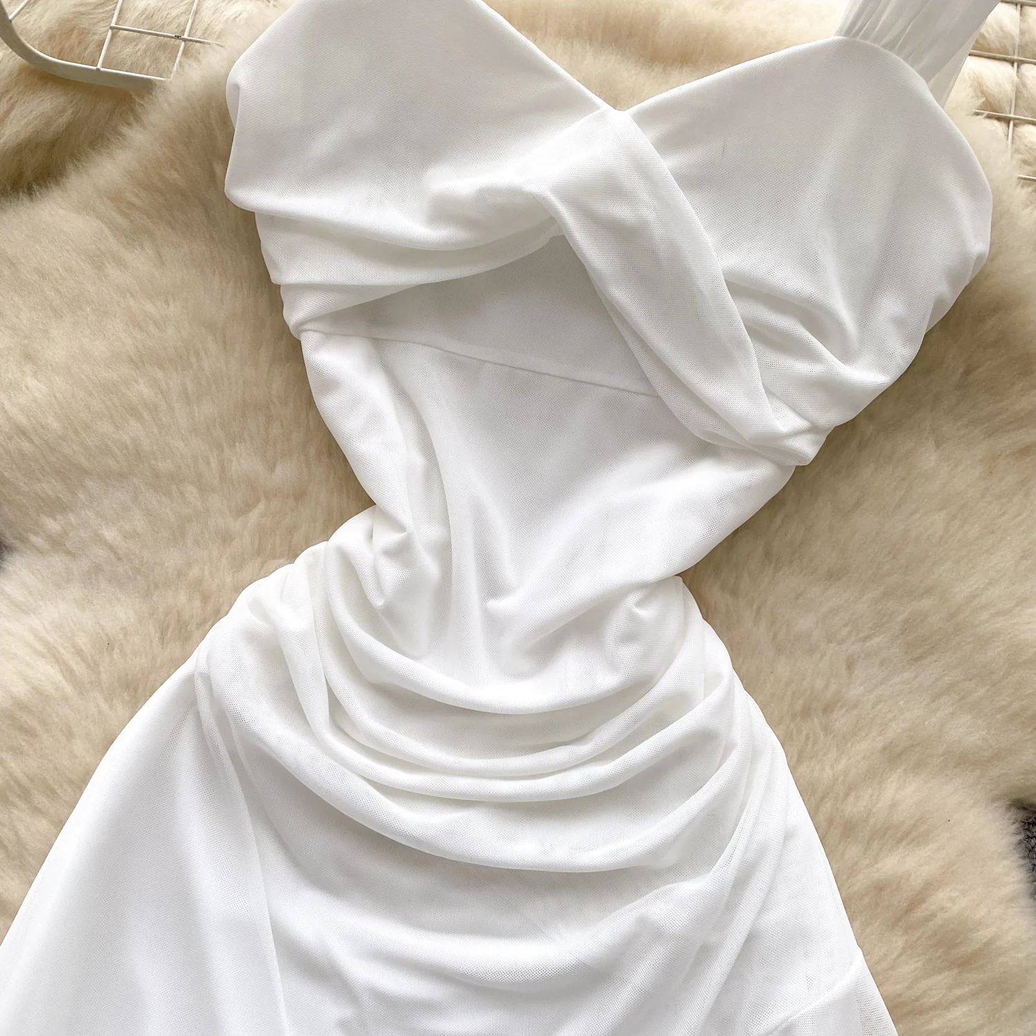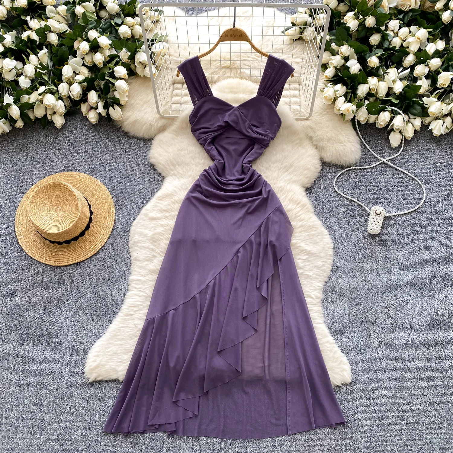 SINGREINY 2025 فرنسا شبكة فستان طويل المرأة حزام الصليب مطوي نحيل تصميم الصيف موضة غير النظامية الكشكشة فستان عطلة