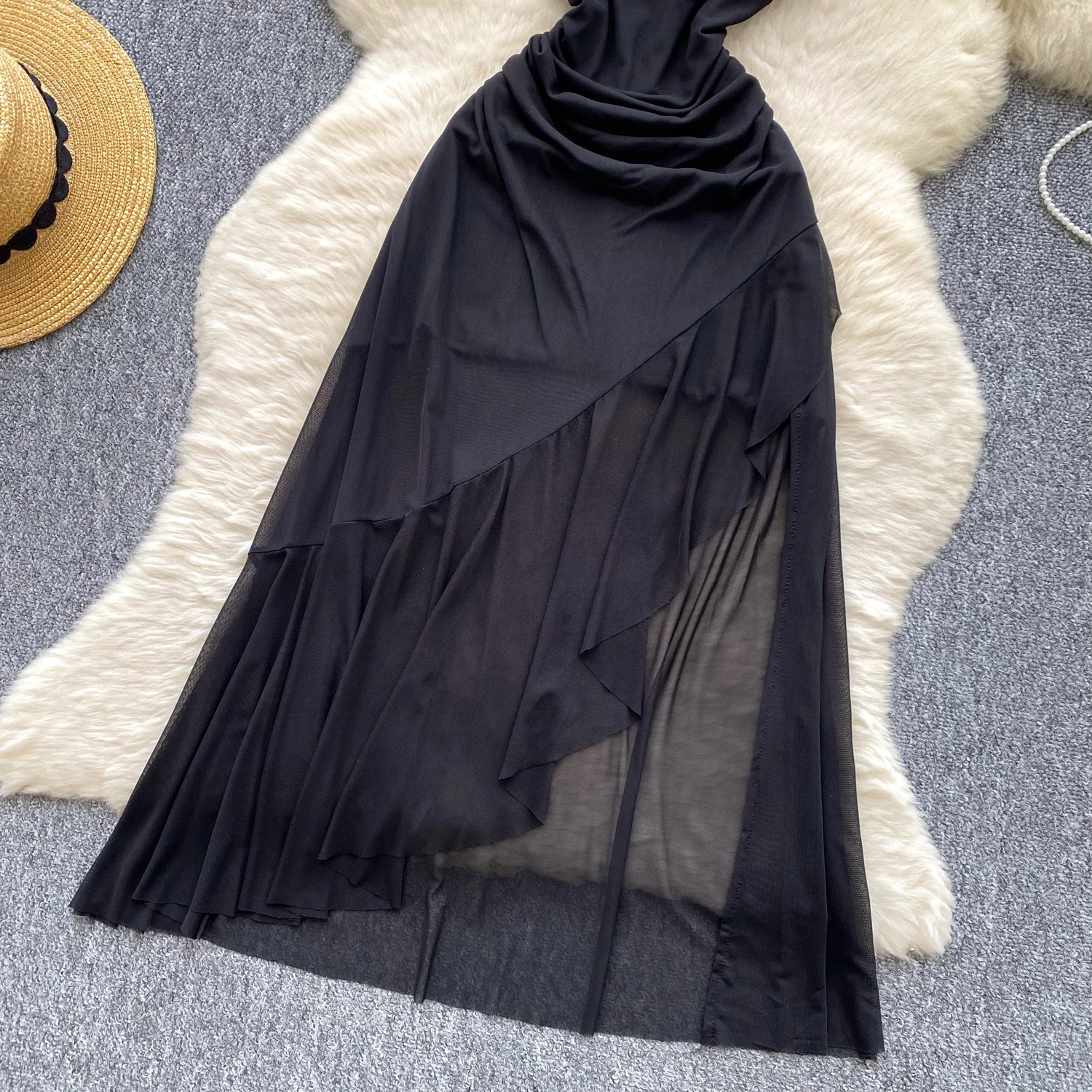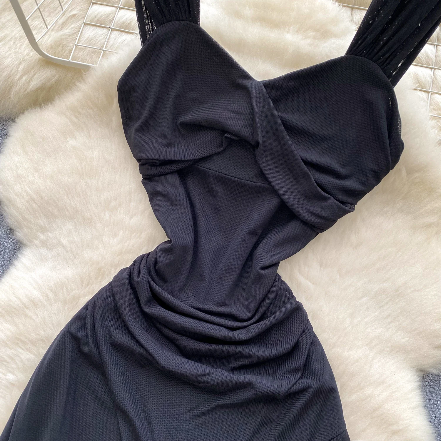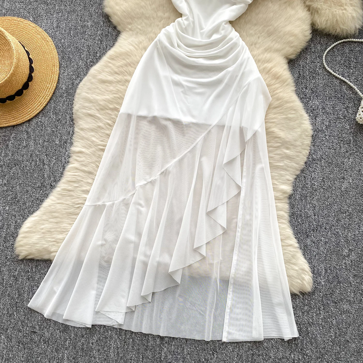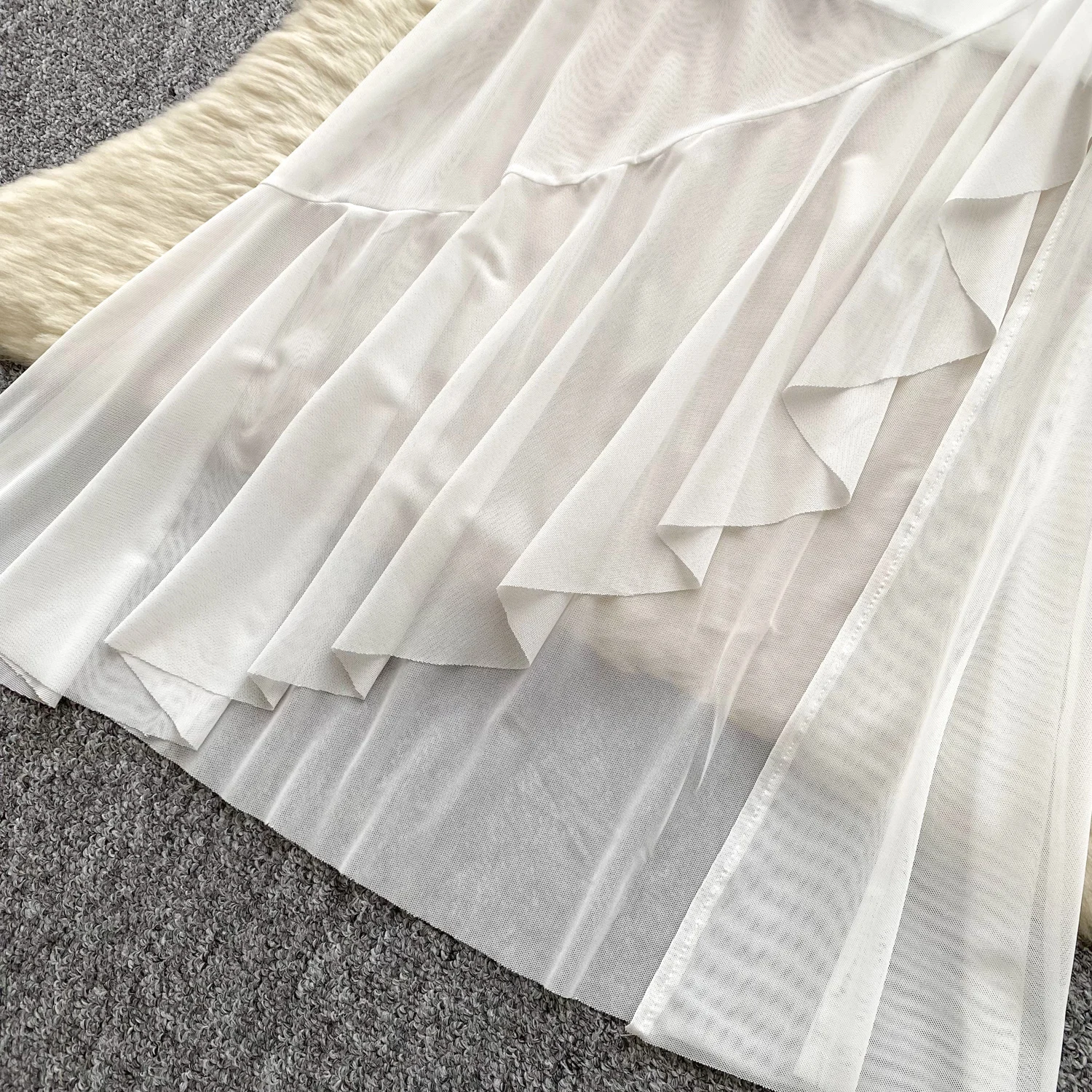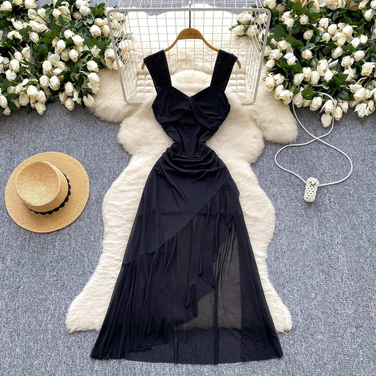 SINGREINY 2025 فرنسا شبكة فستان طويل المرأة حزام الصليب مطوي نحيل تصميم الصيف موضة غير النظامية الكشكشة فستان عطلة
