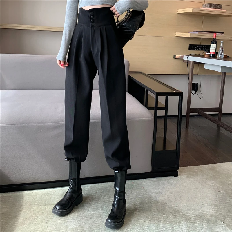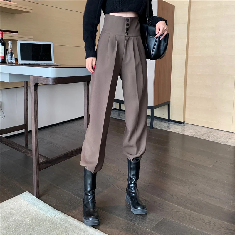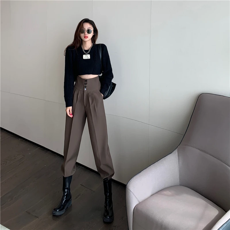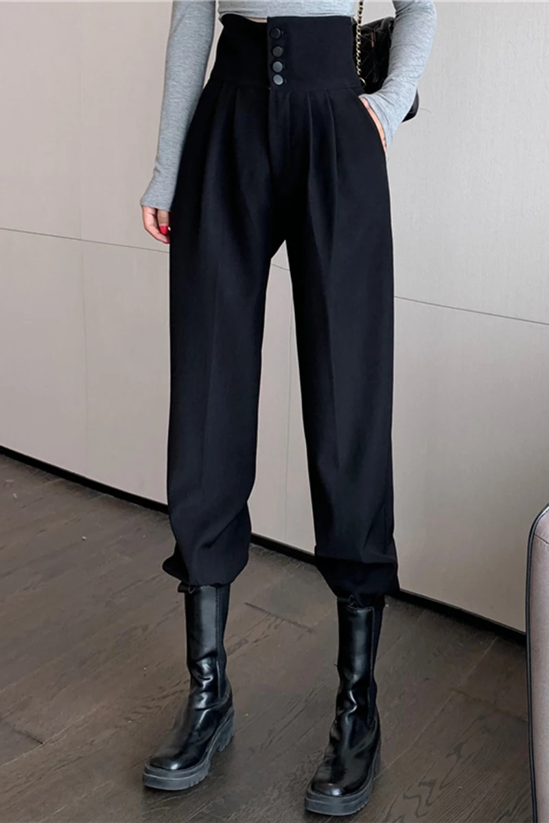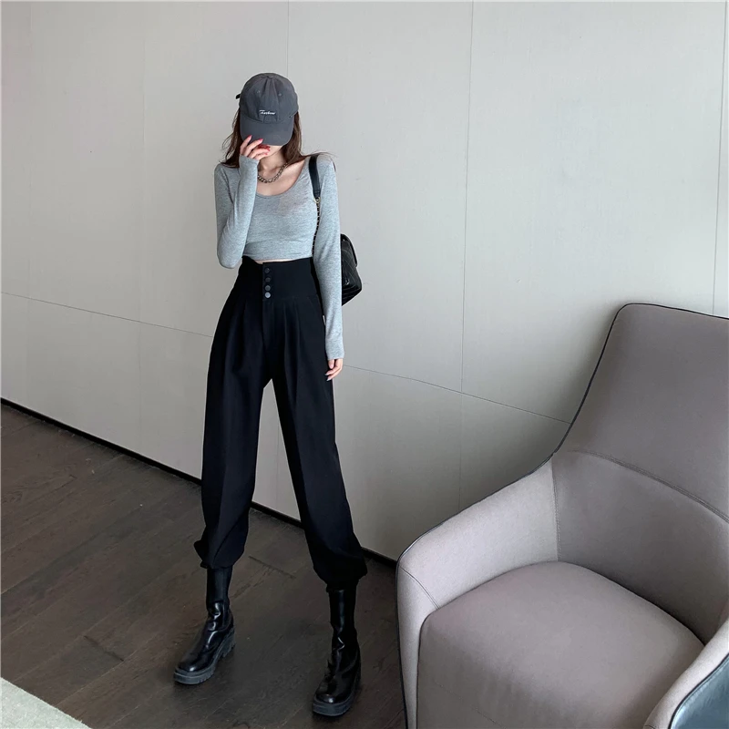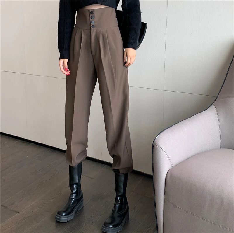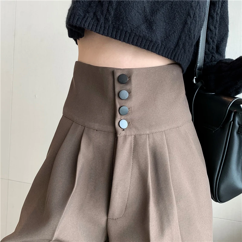 YUANYUANJYCO ربيع الخريف المرأة طويلة عادية سراويلي حريمي الكورية نمط موضة عالية الخصر أزرار الكاكي الأسود البضائع بنطلون