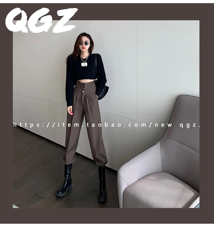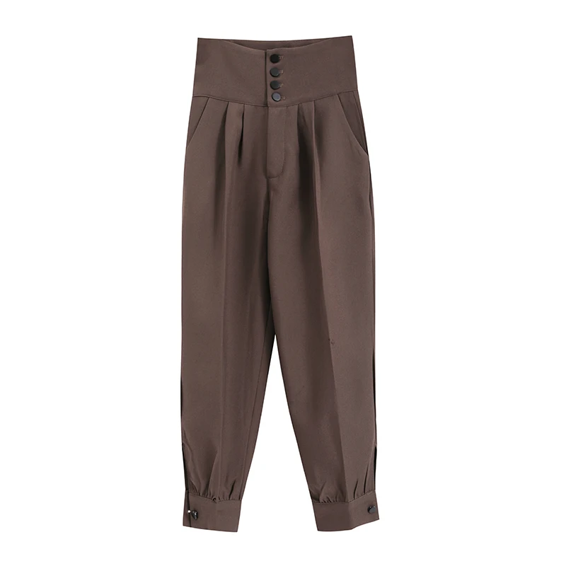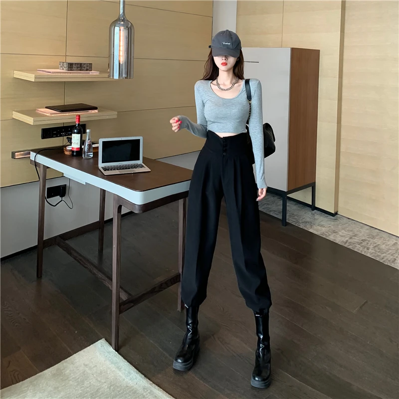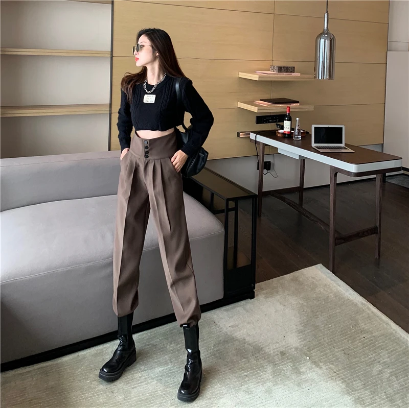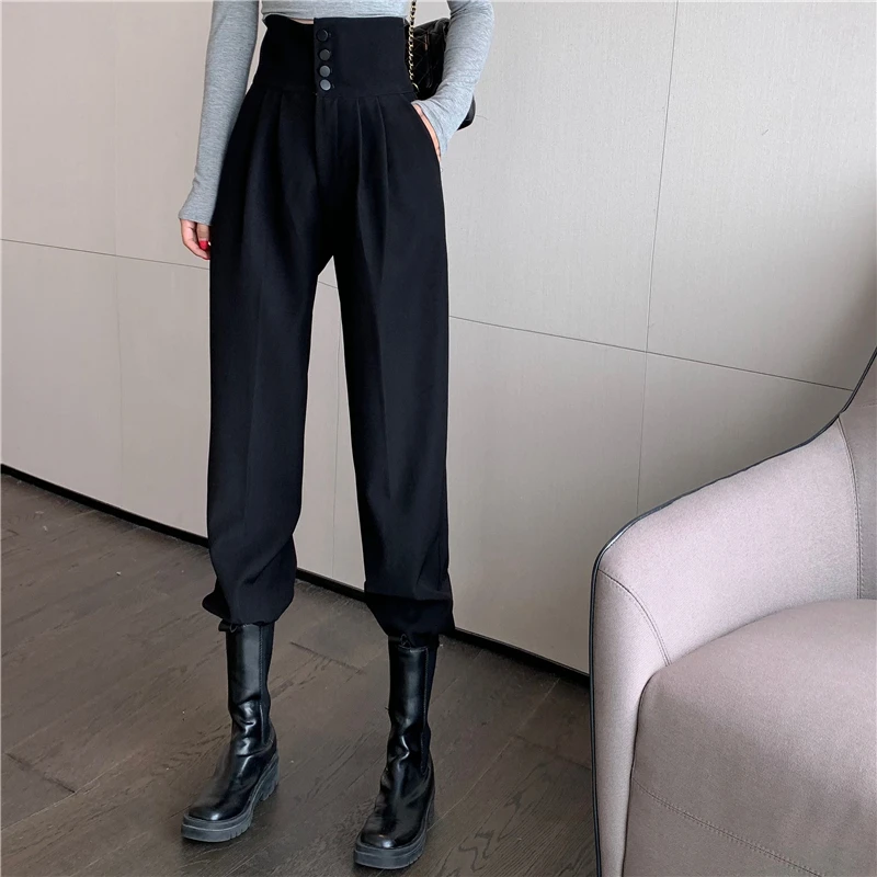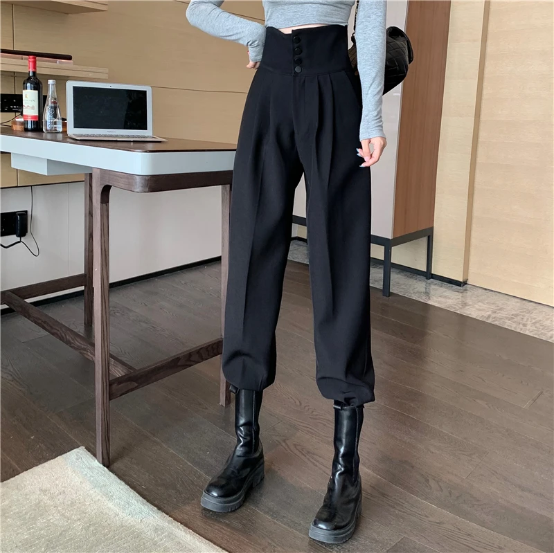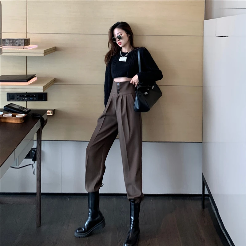 YUANYUANJYCO ربيع الخريف المرأة طويلة عادية سراويلي حريمي الكورية نمط موضة عالية الخصر أزرار الكاكي الأسود البضائع بنطلون